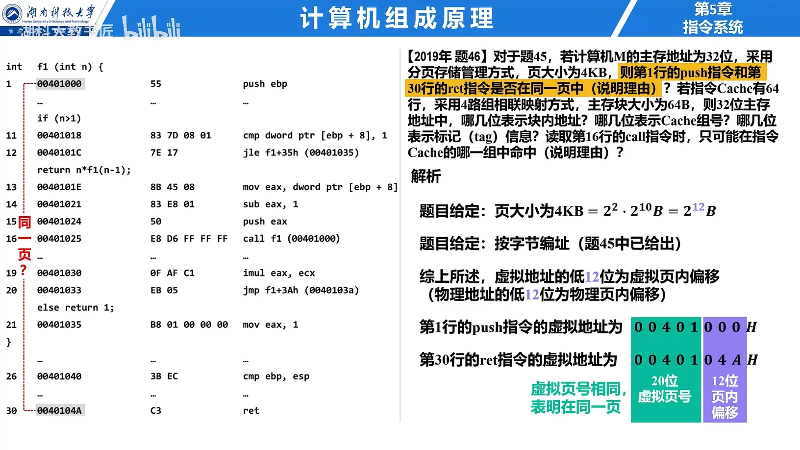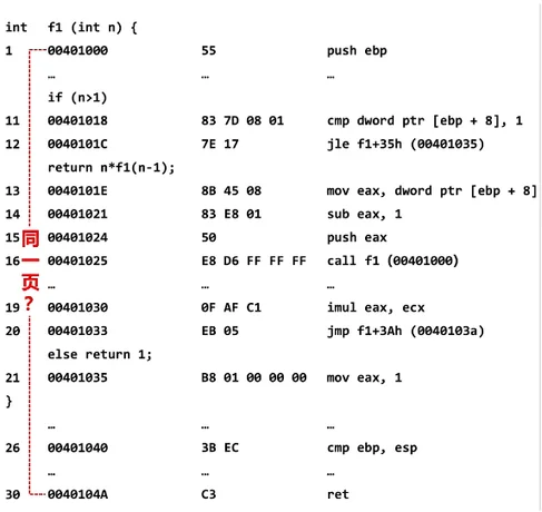 则第 1 行的 push 指令和第 30 行的 ret 指令是否在同一页中(说明理由)?