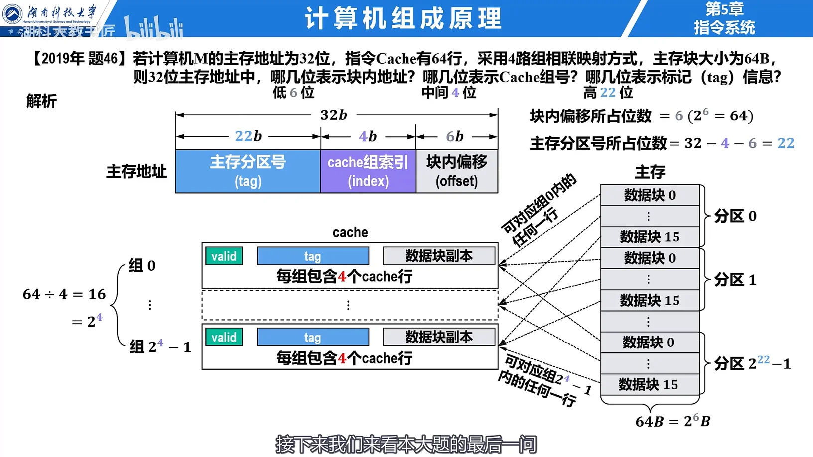 若指令 Cache 有 64 行,采用 4 路组相联映射方式,主存块大小为 64B,则 32 位主存地址中,哪几位表示块内地址?