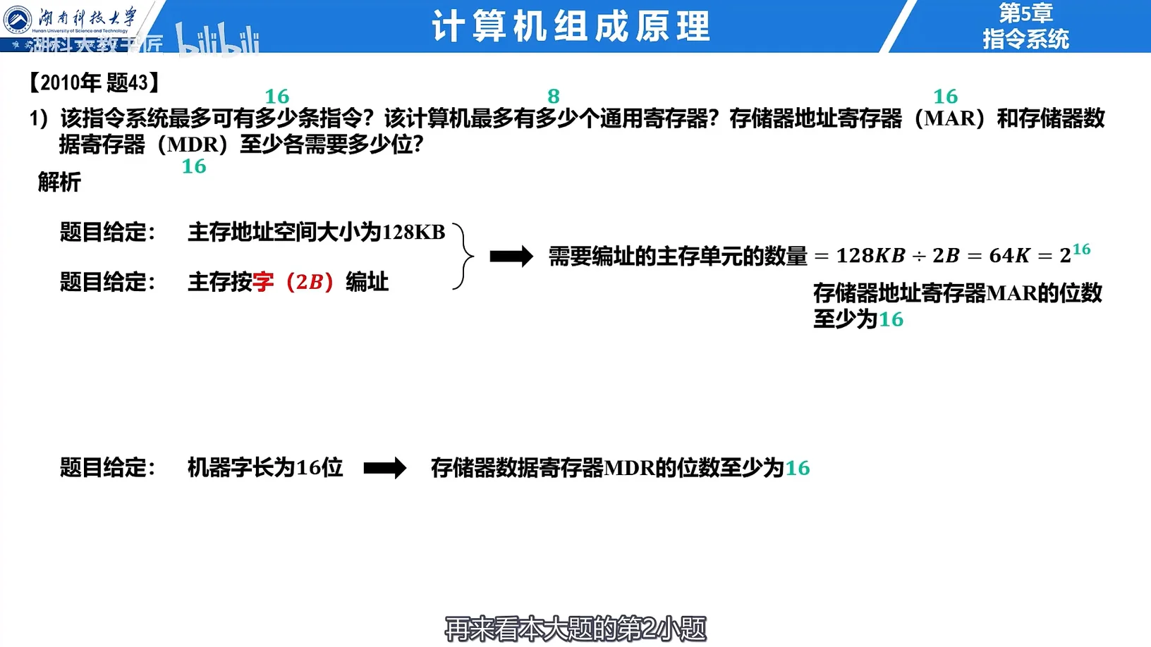 条指令。操作数占 6 位,其中寻址方式占 3 位、寄存器编号占 3 位,因此该机最多有 个通用寄存器。主存地址空间大小为 128KB,按字编址,字长为 16 位,共有 个存储单元,因此 MAR 至少为 16 位;本题已说明了存储字长为 16 位,因此 MDR 至少为 16 位。 - 寄存器字长为 16 位,