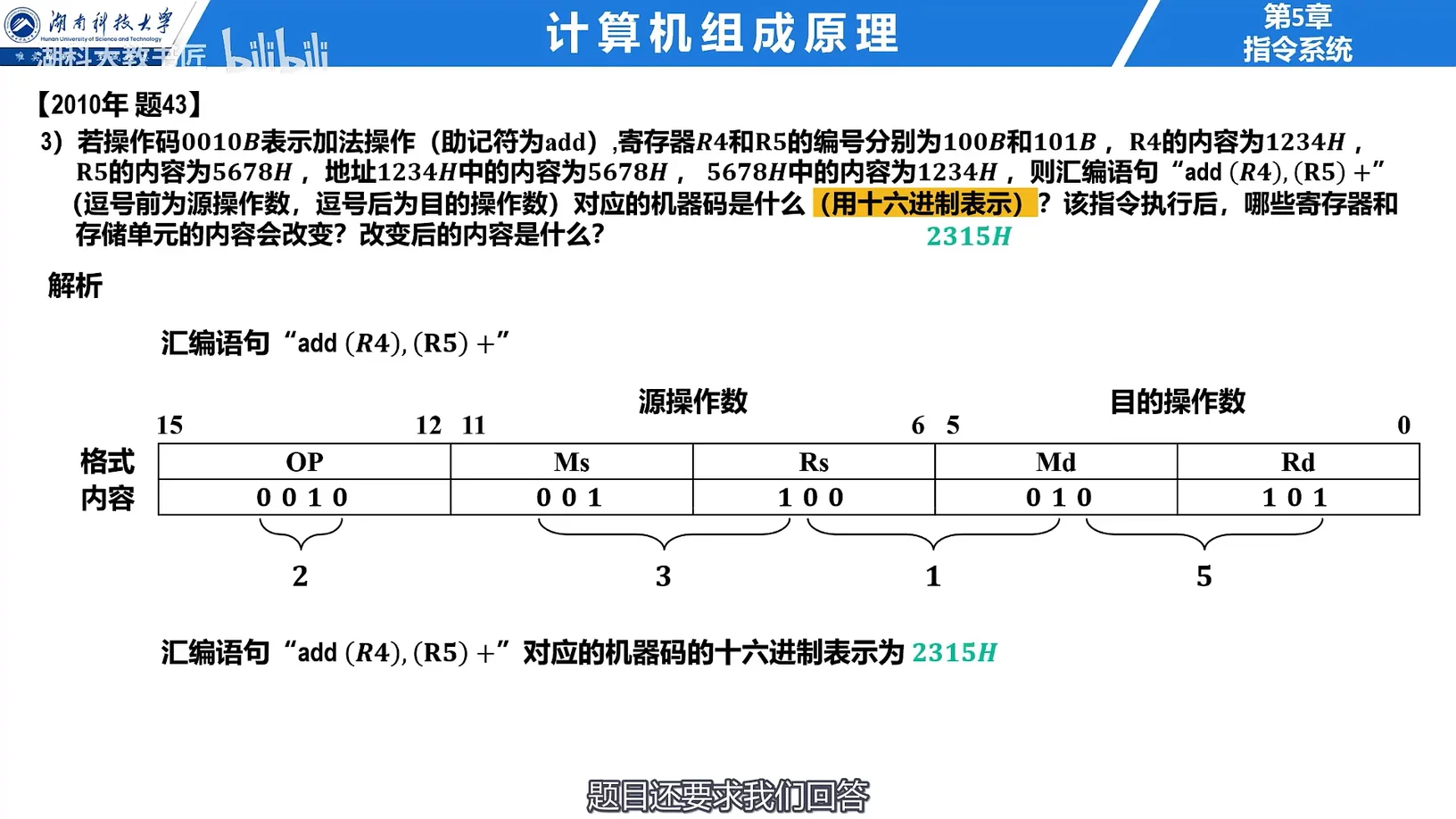 (3) 若操作码0010 B表示加法操作 (助记符为 add), 寄存器R4和R5的编号分别为100B和101B, R4 的内容为