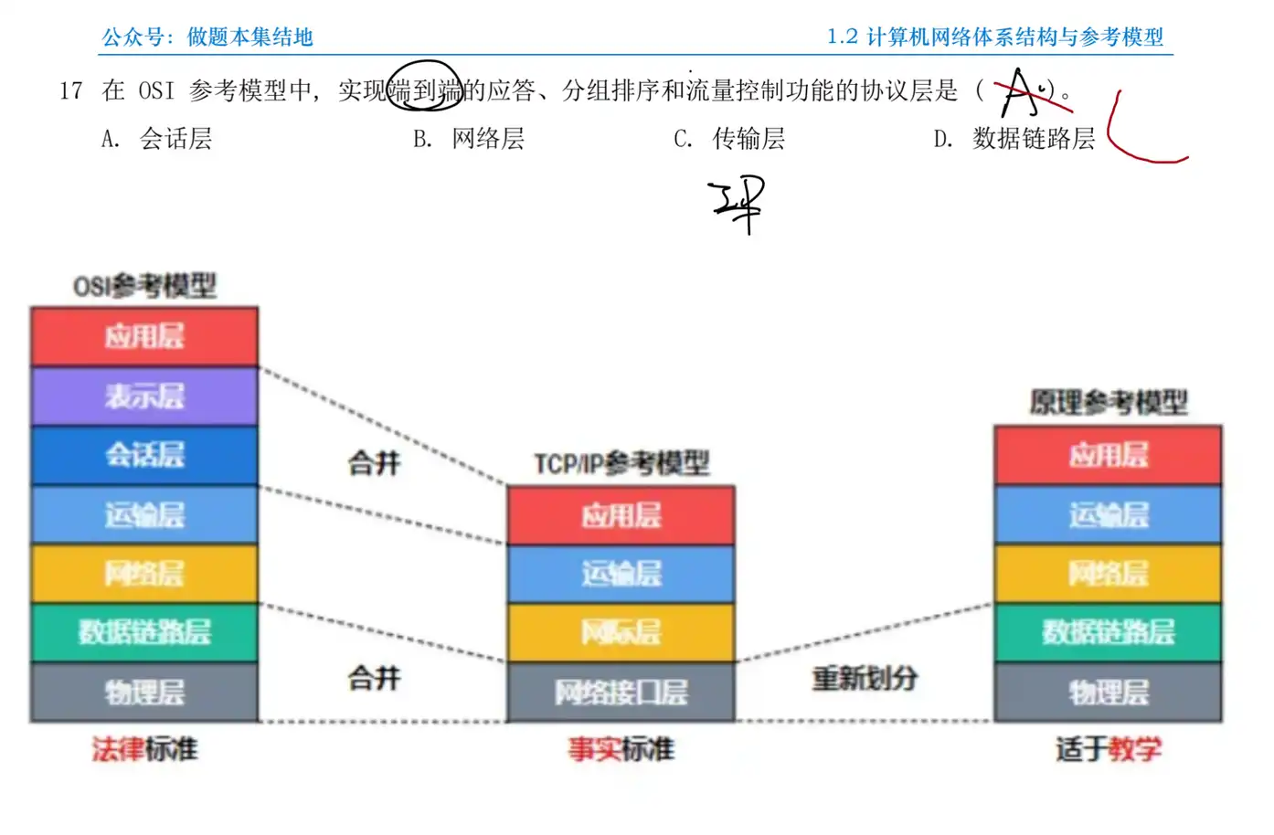 A:本题容易误选 D。ISO/OSI 参考模型在网络层支持无连接和面向连接的通信, 但在传输层仅支持面向连接的通信; TCP/IP 模型在网络层仅有无连接的通信, 而在传输层支持无连接和面向连接的通信。两类协议栈的区别是联考的考点, 而这个区别是常考点。