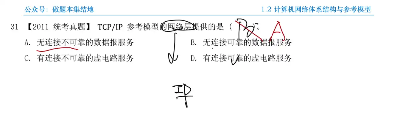 Q:【2011 统考真题】 TCP/IP 参考模型的网络层提供的是 ( )。