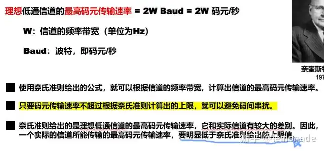 - 奈氏准则只考虑了带宽与极限码元传输速率之间的关系。