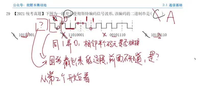 Q:【2021 统考真题】下图为一段差分曼彻斯特编码信号波形, 该编码的二进制串是 ( )。
