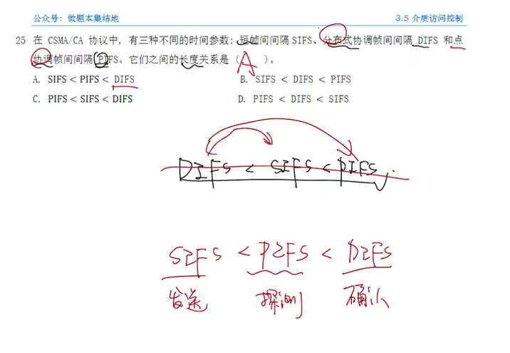Q:在 CSMA/CA 协议中,有三种不同的时间参数:短帧间间隔 SIFS、分布式协调帧间间隔 DIFS 和点协调帧间间隔 PIFS。它们之间的长度关系是 ( )。