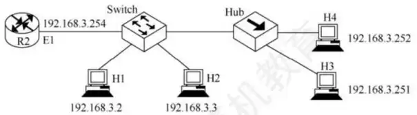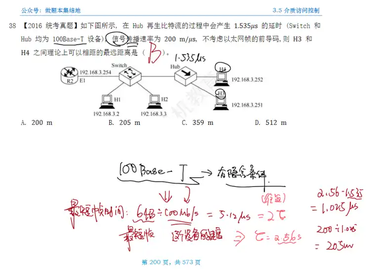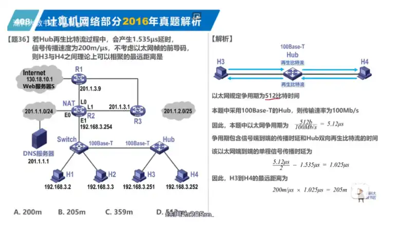 Q:【2016 统考真题】如下图所示,在 Hub 再生比特流的过程中会产生 的延时 (Switch 和 Hub 均为 100Base-T 设备),信号传播速率为 ,不考虑以太网帧的前导码, 则 H3 和 H4 之间理论上可以相距的最远距离是 ( )。