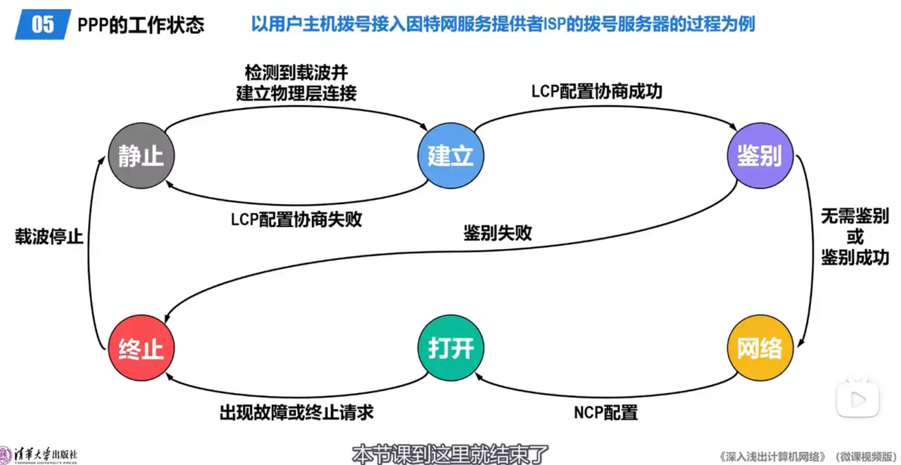 - 网络控制协议 NCP(NetWork Control Protocol):PPP 可以支持多种网络层协议,每个不同的网络层协议都要一个相应的 NCP 来配置,为网络层协议建立和配置逻辑连接。