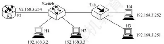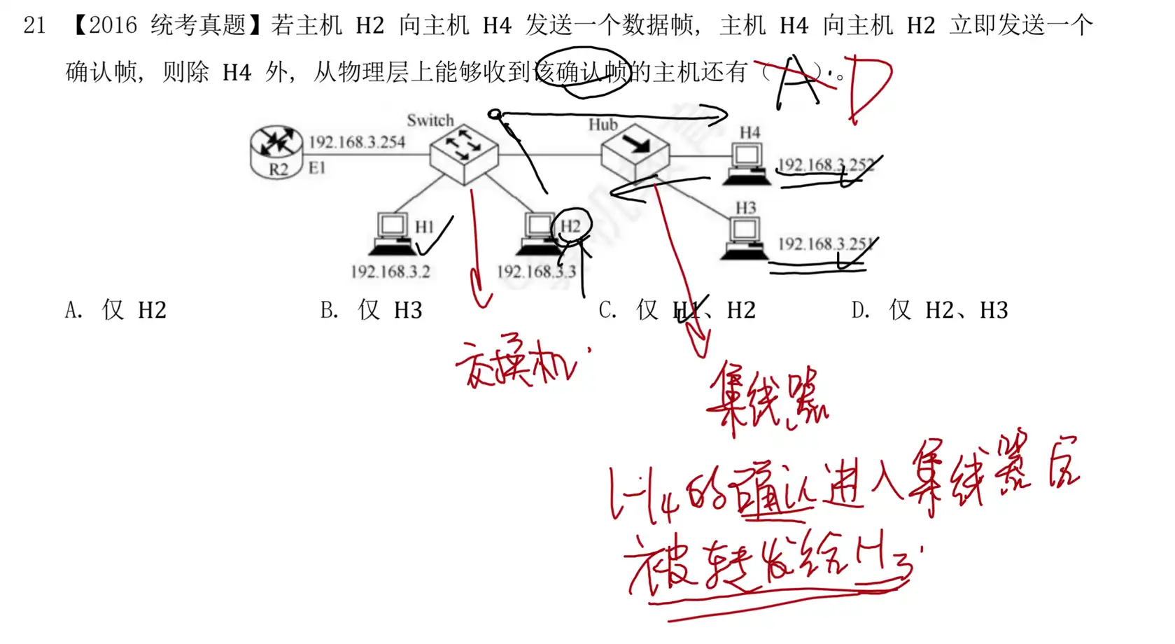 Q:【2016 统考真题】若主机 H2 向主机 H4 发送一个数据帧, 主机 H4 向主机 H2 立即发送一个确认帧,则除 H4 外,从物理层上能够收到该确认帧的主机还有(