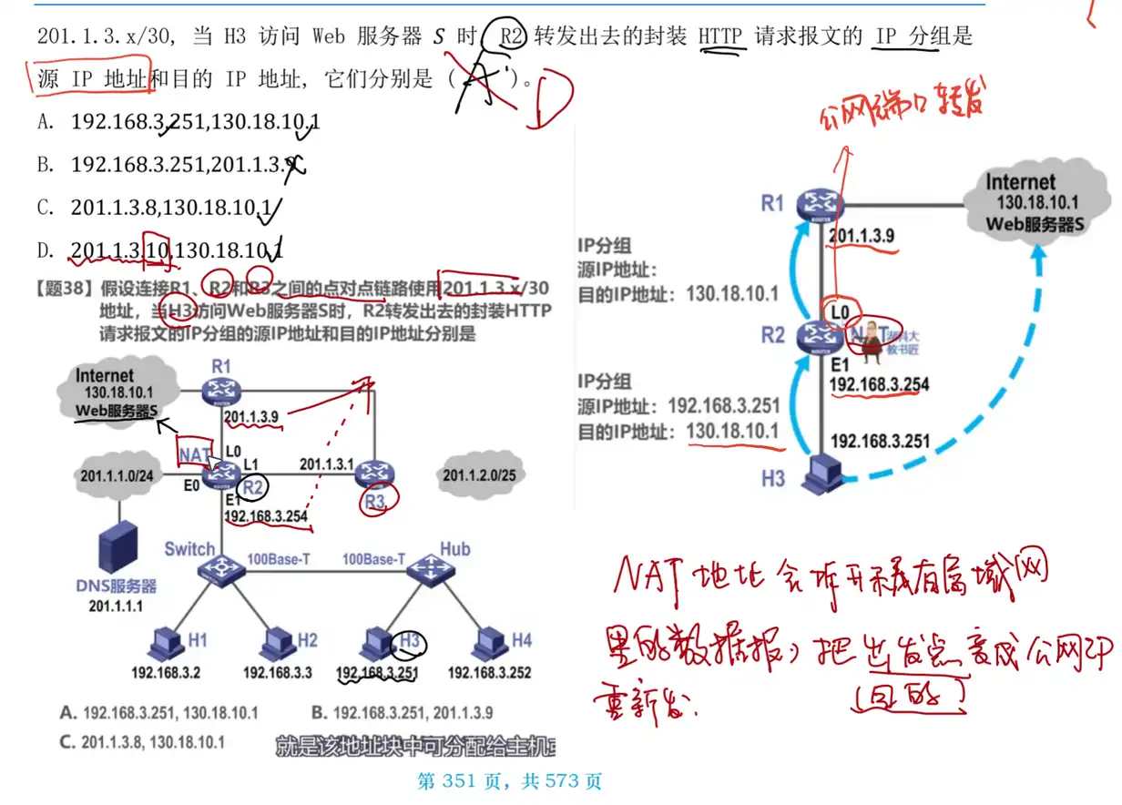 A:当内网用户向公网发送 IP 分组时, NAT 路由器会更改 IP 分组的源地址, 因此下一步就是求 R1 的公网 IP 地址。连接 R1、R2 和 R3 之间的点对点链路使用 201.1.3.x/30 地址, 可知该地址块的 IP 地址的后两位为主机号, 而主机号全 0 和全 1 的 IP 地址不能分配, 因此若已知路由器之间的点对点链路中的一个路由器接口的 IP 地址, 就可求出另一路由器接口的 IP 地址。在 R1 和 R2 相连的链路中,已知 R1 端接口的 IP 地址为 201.1.3.9/30, 将其后 8 位展开成二进制为 所以可分配给 R2 的 L0 接口的 IP 地址为 201.1.3.10。同理, 也可求出 R2 的 L1 接口的 IP 地址为 201.1.3.2。访问 Web 服务器, 只能通过 R1 的接口 L0 或 L1 转发, 所以经过 R1 转发后, IP 分组的源地址可能为 201.1.3.10 或 201.1.3.2, 目的地址为 Web 服务器的 IP 地址 130.18.10.1。