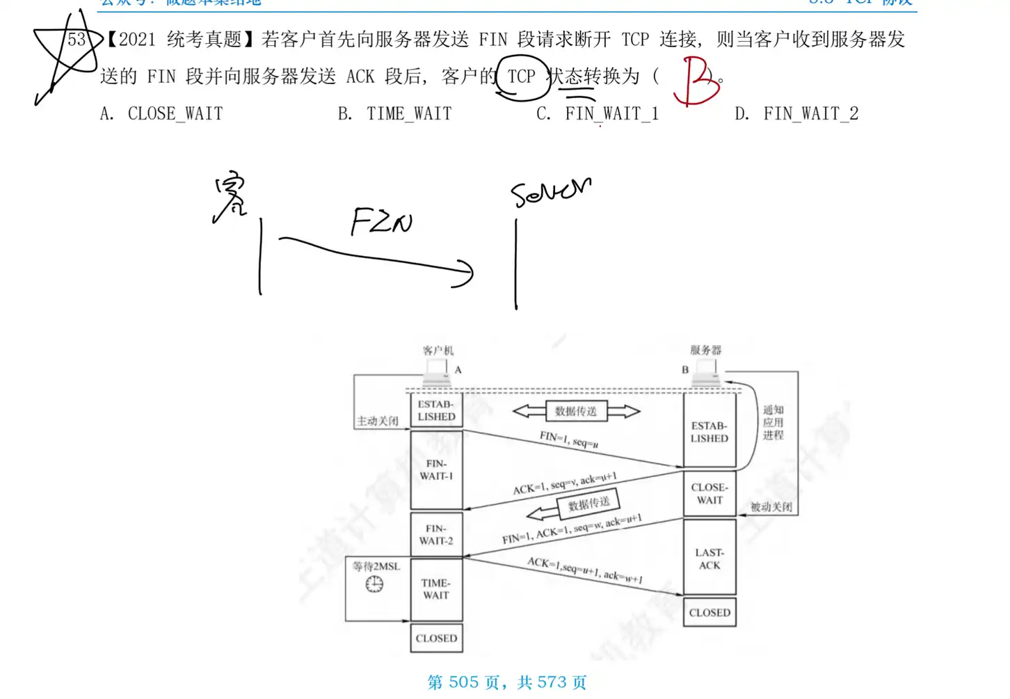 Q:【2021 统考真题】若客户首先向服务器发送 FIN 段请求断开 TCP 连接, 则当客户收到服务器发送的 FIN 段并向服务器发送 ACK 段后, 客户的 TCP 状态转换为 ( )。