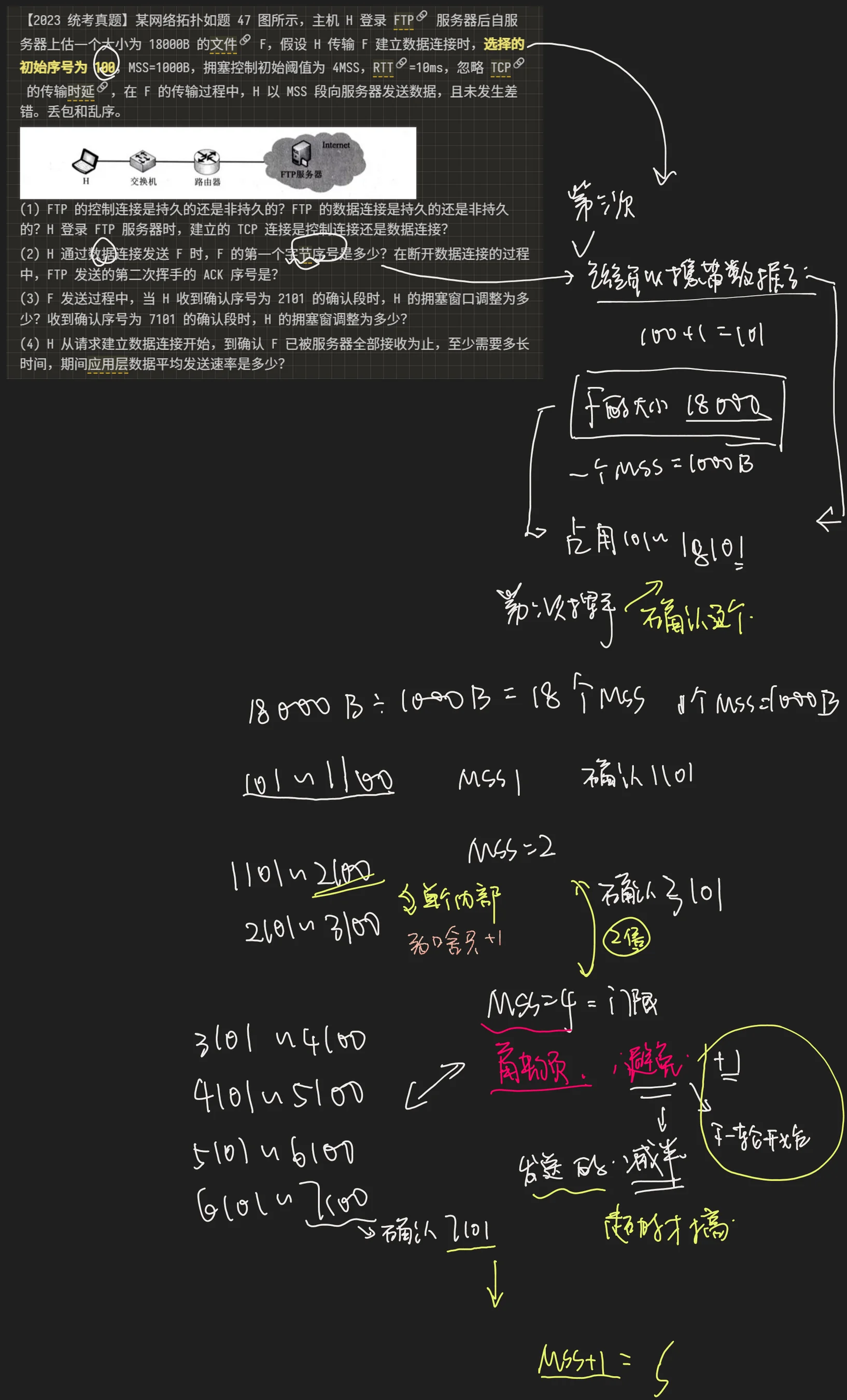 1. 每个传输轮次传输的数据量如下表所示,文件 的大小 ,则发送完 要 经过 5 个 RTT, 此外还要 1 个额外的 RTT 用来建立 TCP 连接。因此, H 从请求建立数据 连接开始,到确认 已被服务器全部接收为止,至少需要 ; 期间应用层数据平均发送速率是