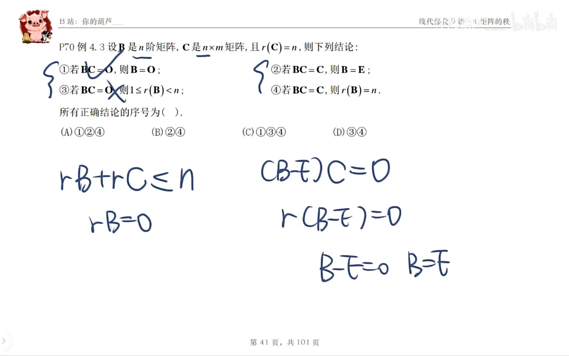 A:一二选项用西尔维斯特不等式,三四选项移项以后用,值得注意的是,要充分地先给矩阵方程做化简看看