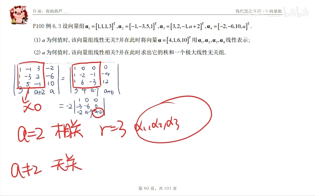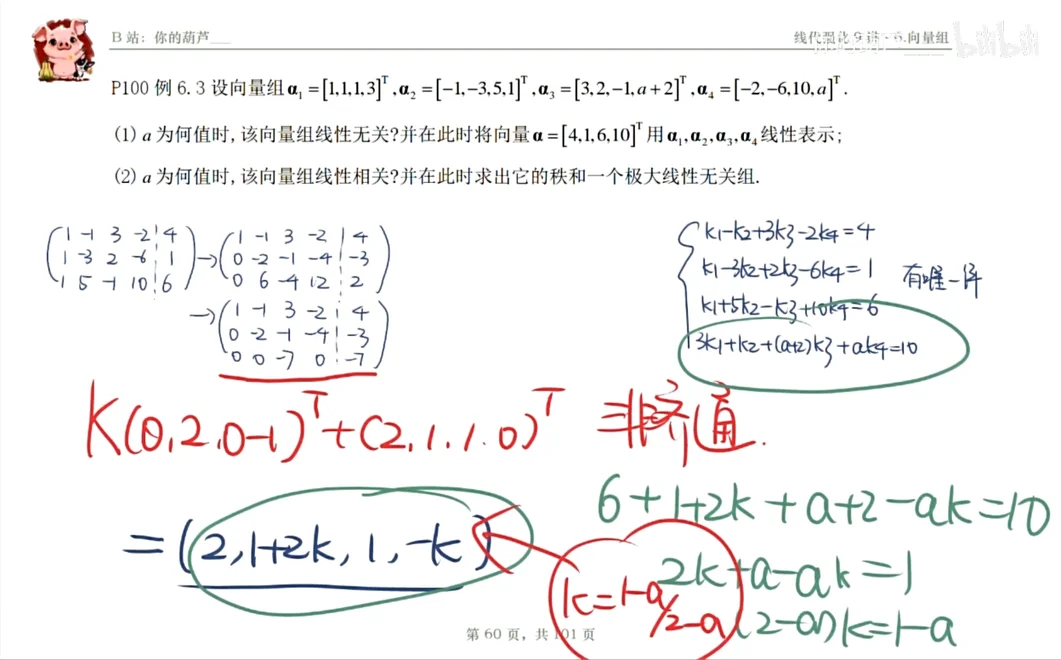 葫芦的第二问算线性相关的线性表示时,展示了一个含有参数的很大的非齐次线性方程组怎么解方程的技巧,尝试把没有参数的小非齐方程组的齐通+非齐特解出来,后面的有参数的式子的解的结构,必然满足他的子集的这个解的结构,只需要把解的结构直接带入含参的新方程就简化计算来解了