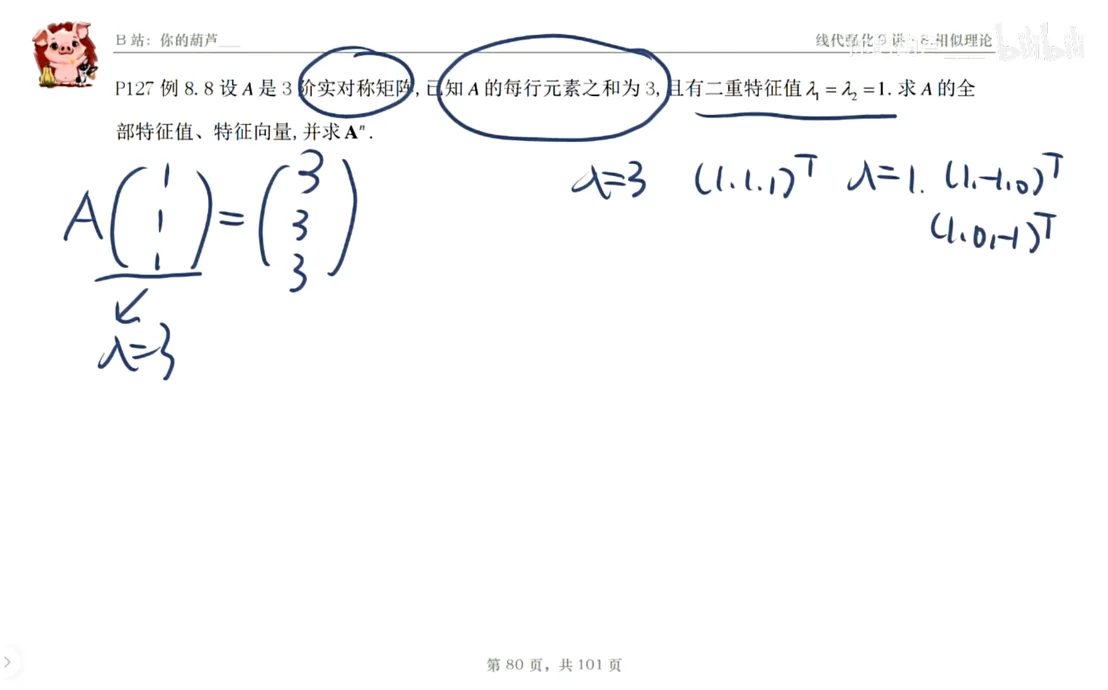 A:积累一个写特征多项式的手法,就是这里的每行元素之和如何表示,应该写成,这就和定义的式子对应了,左边是特征向量,右边是特征值倍数的特征向量