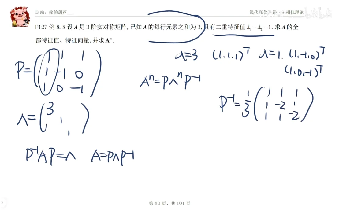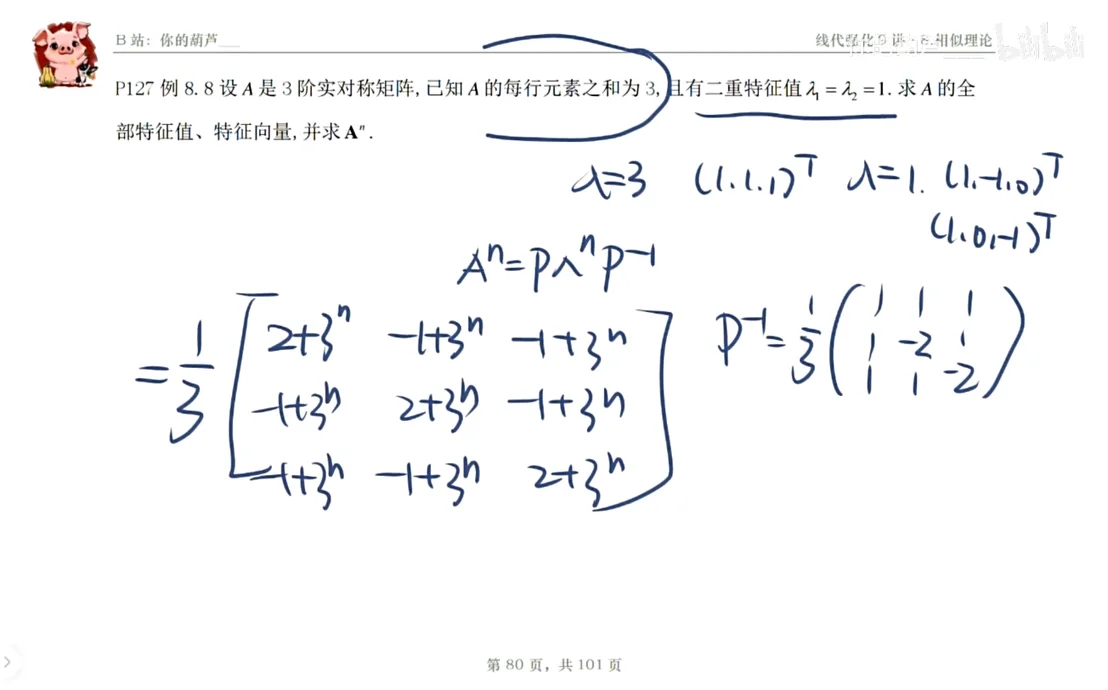 Q:P127 设 是 3 阶实对称矩阵,已知 的每行元素之和为 3,且有二重特征值 . 求 的全部特征值、特征向量,并求 .