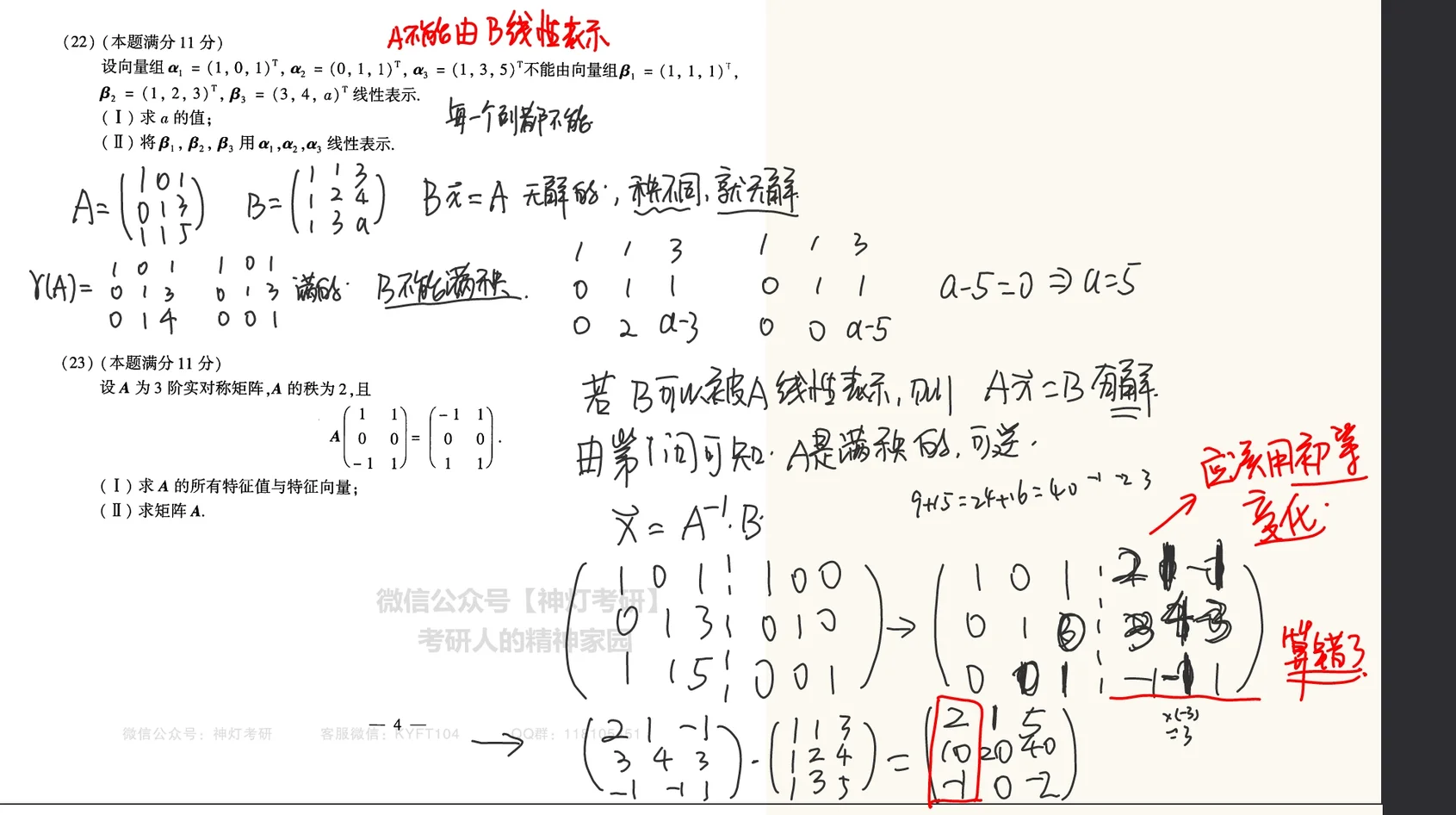 (II) (法一) 求 的线性表示,相当于求 的解. 的列向量的坐标为线性表示的系数,即 .