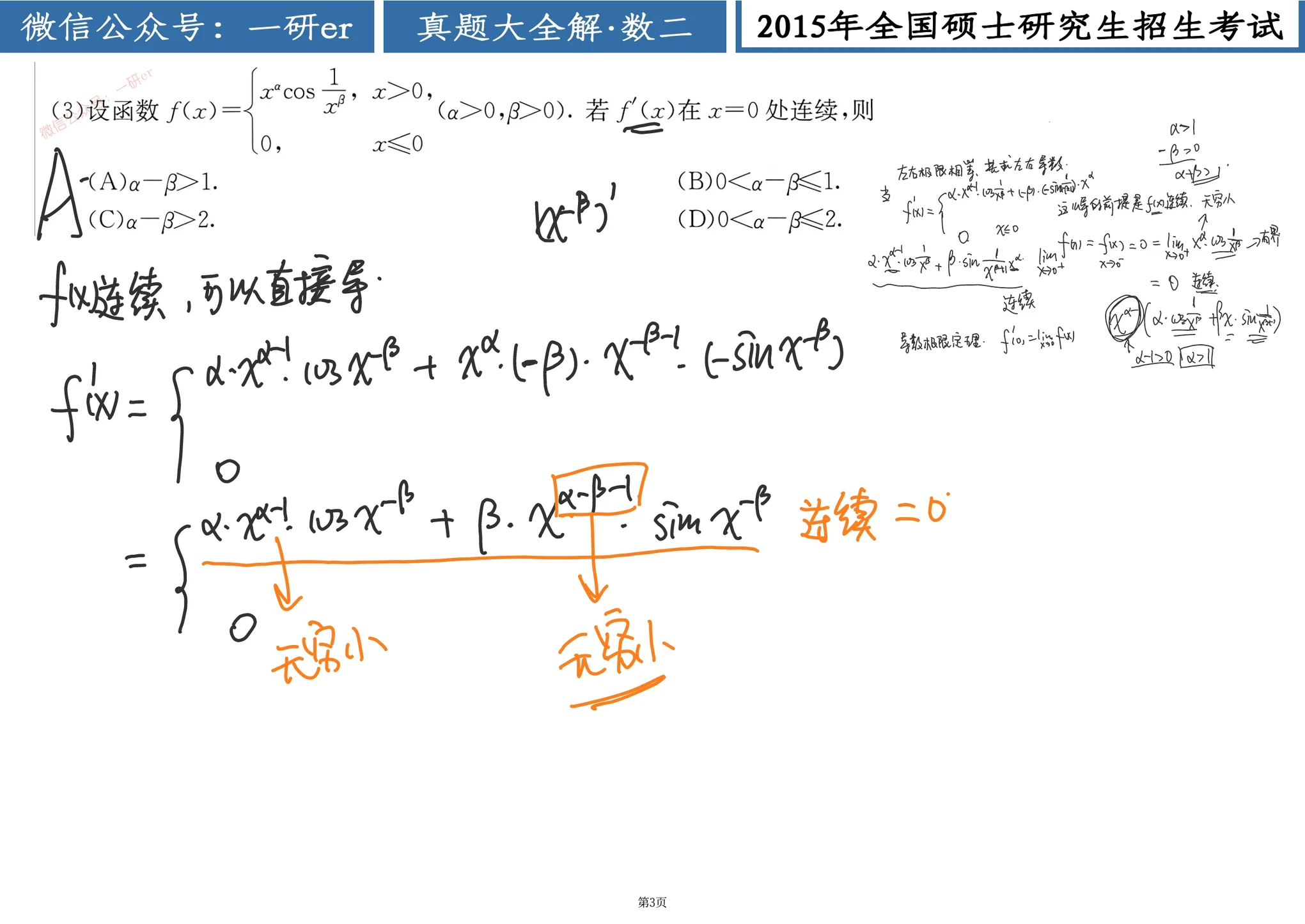 对于这种分段的函数求导,或者求极限,判断是否存在间断点的,我经常有疑问什么时候用公式,什么时候直接用定义,我们在真题:题3中同样有这个问题,这种题目还可以结合变限积分来考。