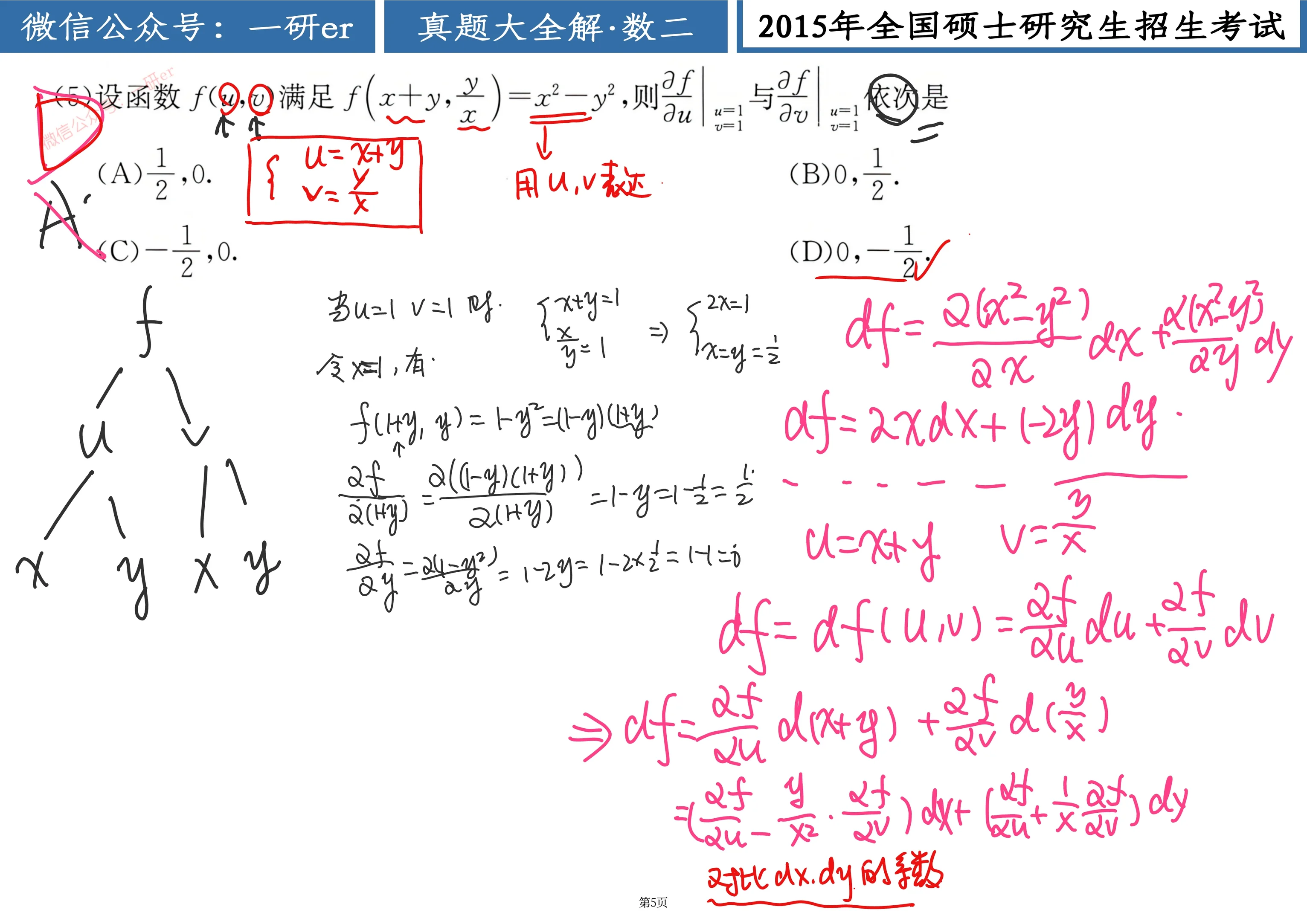 A:对于这种多元复合函数的微分也是我的一个老大难问题,也就是这种复合换元,把关于x和y的函数换元为另外两个变量,然后倒腾来倒腾去的,核心应该是反解uv或者利用全微分形式的不变性,以不同的形式考了很多遍,有的时候是先给xy,再把xy变换为uv,比如有的年的真题:例13.45,有的就是这种,先给uv,再把uv带换为xy
