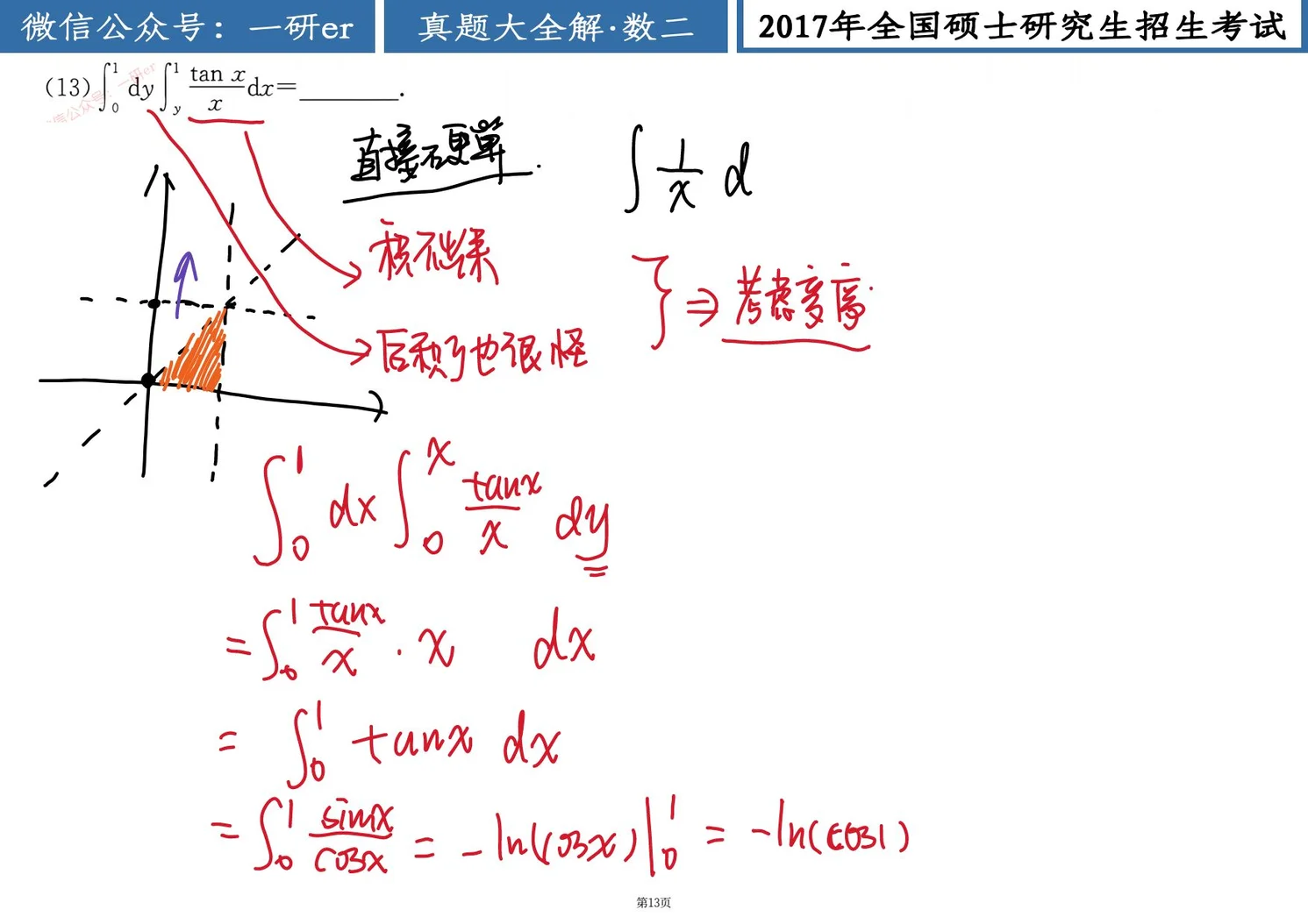 直接计算本题中的二次积分较难, 不妨考虑交换二次积分的积分次序.