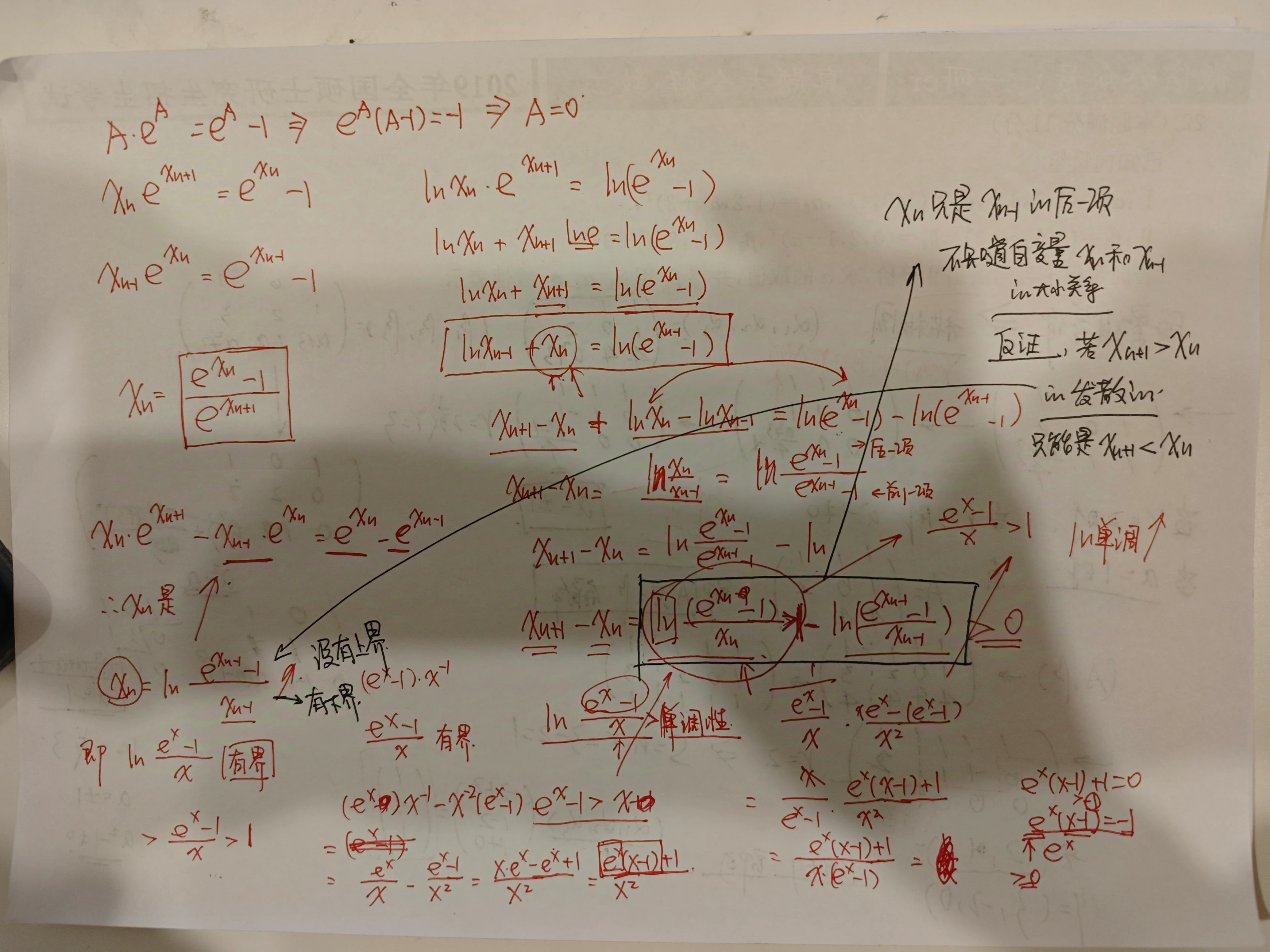 又是数列收敛的证明,核心想法还是用单调有界准则,单调性往往通过构造函数来取得。这个地方出现了指数,所以要考虑两边取对数,化成对数的加减。这道题我中途算错了,但整体的思路是正确的,算错的原因在于:,它只是的后一项。我们当时并不知道前一项和后一项的大小关系。但是呢,我当时看见这个,就下意识地认为是比大的,也就是数列的后一项是比前一项大的。然后我通过单调性就下结论。事实上,这个地方因为不知道谁大谁小,所以可以用反证的方法,如果它是单调递增的,但是最后它却没有上界,也就无法收敛,所以它就是发散的,那么只能是它是单调递减的。然后我们找到了下界。此时证明了这个东西,它是收敛的。