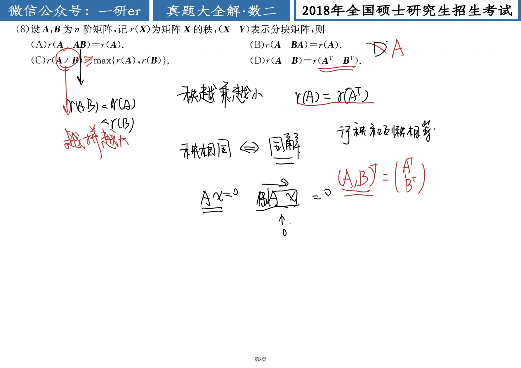 (8) 设 阶矩阵,记 为矩阵 的秩, 表示分块矩阵,则 ( )