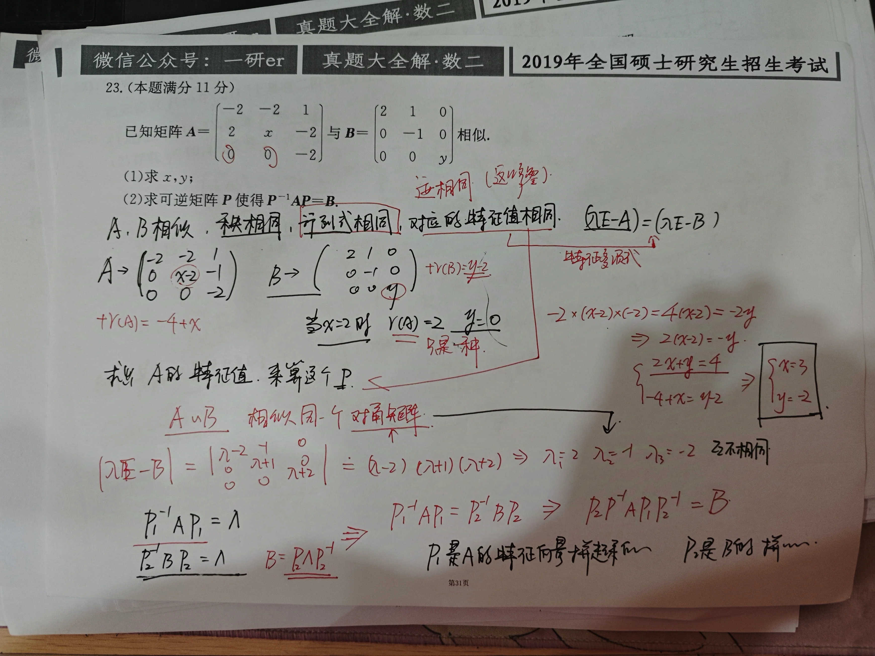 解 (I) 由于 相似,故它们的迹与行列式均相同.