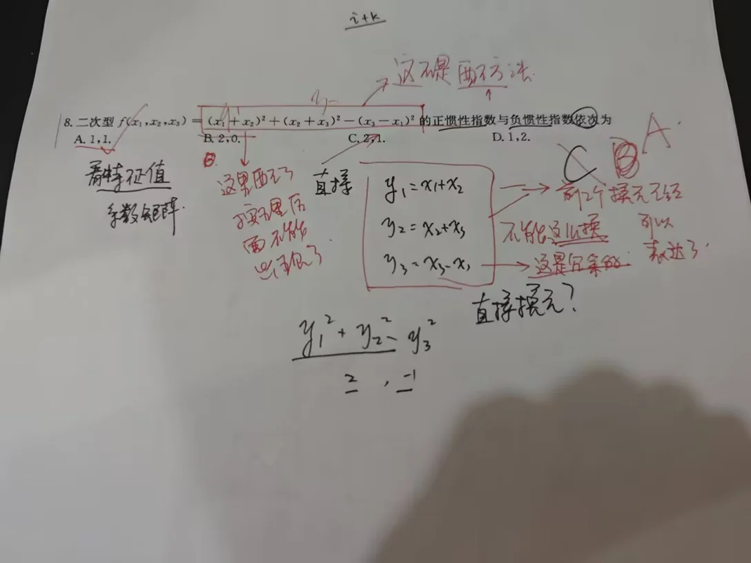 另一方面, 若 的负惯性指数为 0, 则 非负, 即对任意 , 均有 . 但是, , 矛盾. 因此, 选项 A 不正确.