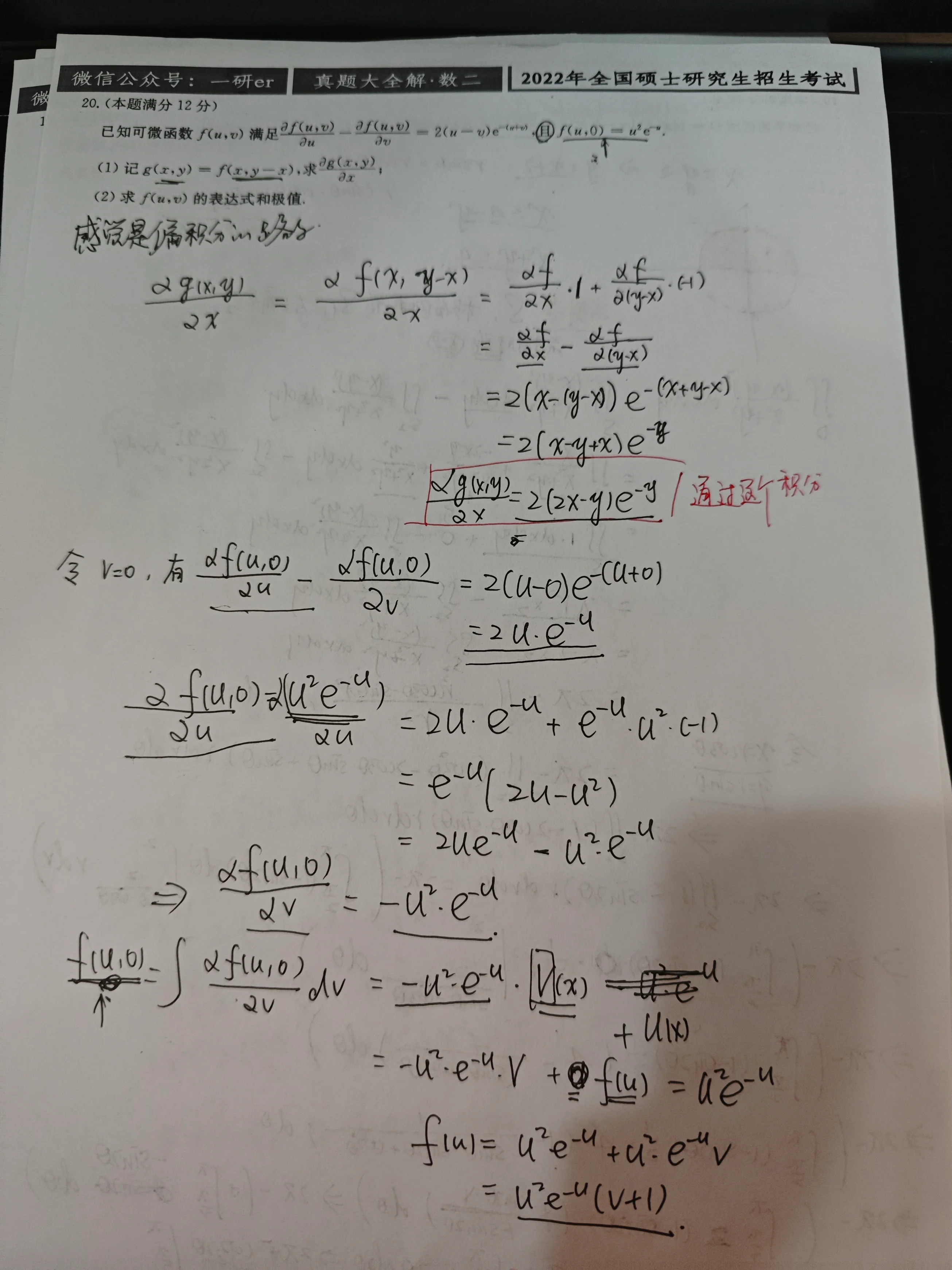 多元复合函数的微分+偏积分的考法,这个题思路是写对了的,但是没再第二问用上第一问的结论,而是自己固执地对着