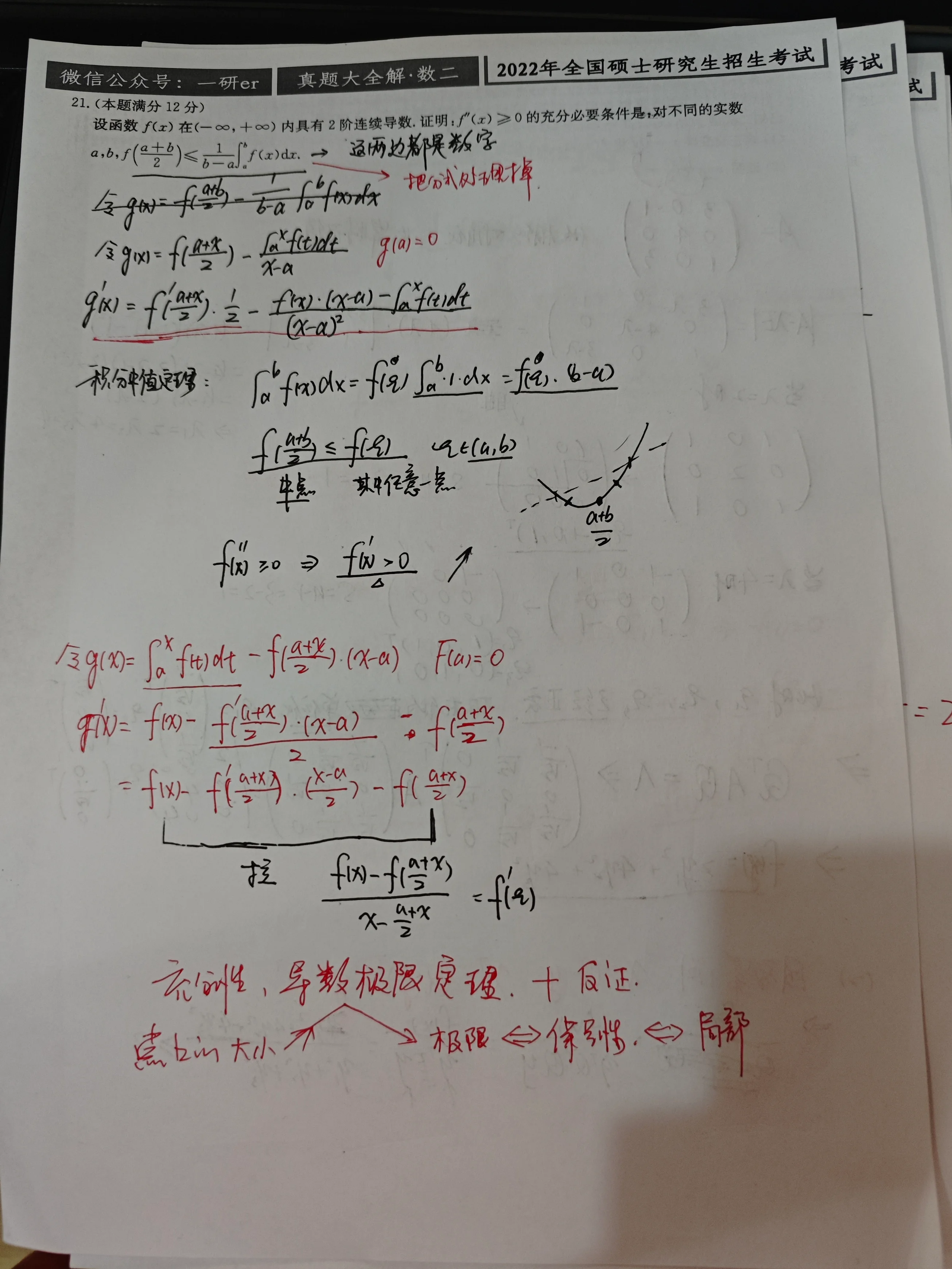 这里一下子跨越了两层,题目只给了原函数和二阶导的关系,只有泰勒公式可以一下实现这个跨度;另一方面,还有一个思考的维度,在于题目给的是两个参数a,b的式子,我们定一个参数为主元x,然后再以一元的视角处理,最后再利用拉格朗日中值定理来处理导数,把一阶导转换到二阶导。另一方面我们证明充分性,考虑题目设置的任意性,应该用反证法,再利用导数极限定理,把一点处函数的性质,转换为极限也就是,局部的保号性,进而推广为区间来处理