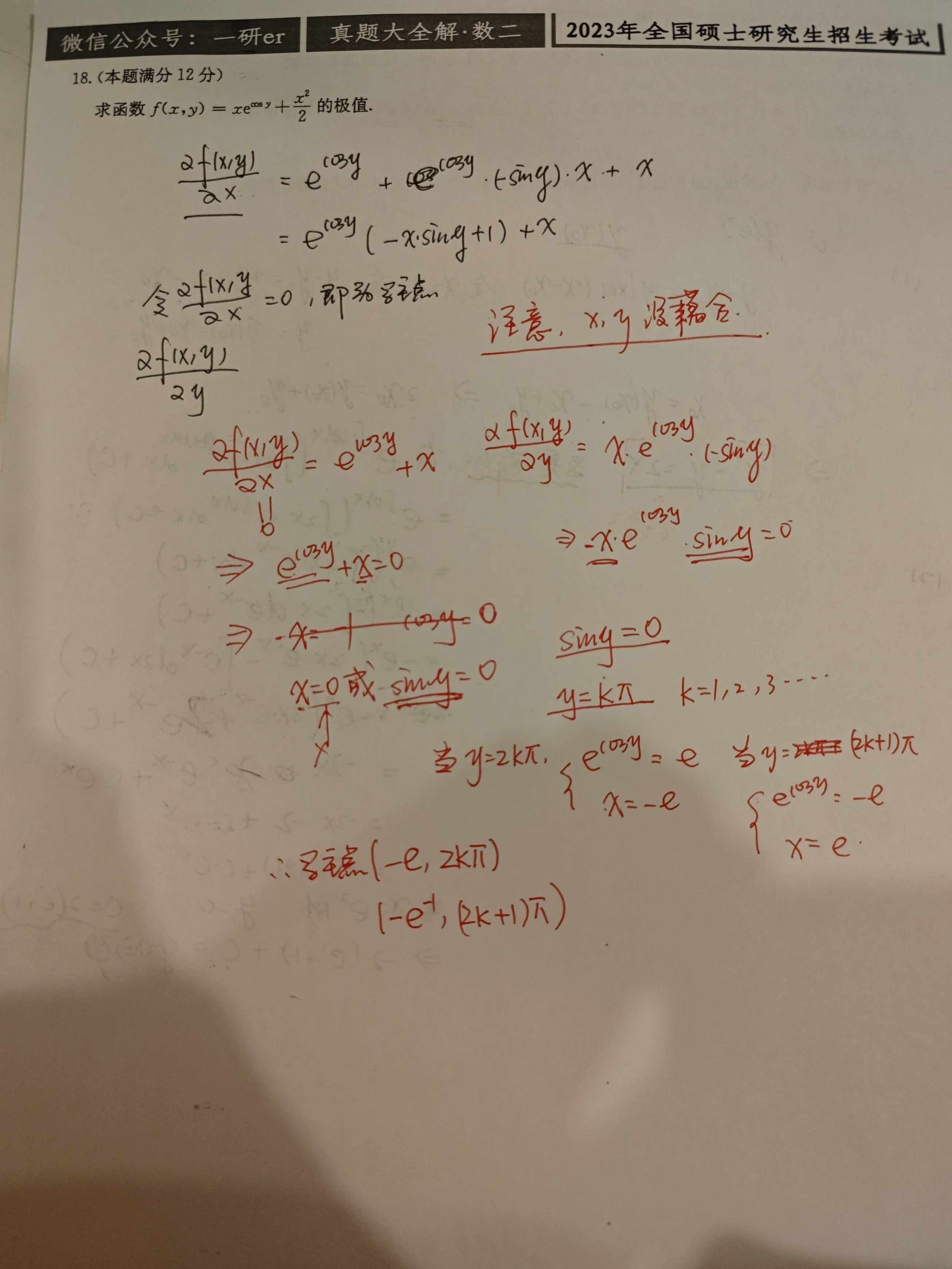 2023 年数学一试题的第 (18) 题也是二元函数的无条件极值问题, 在该题中, 既需要用到二元函数极值存在的充分条件来判定极值, 也需要利用定义来判定极值. 大家可以留作练习:题308