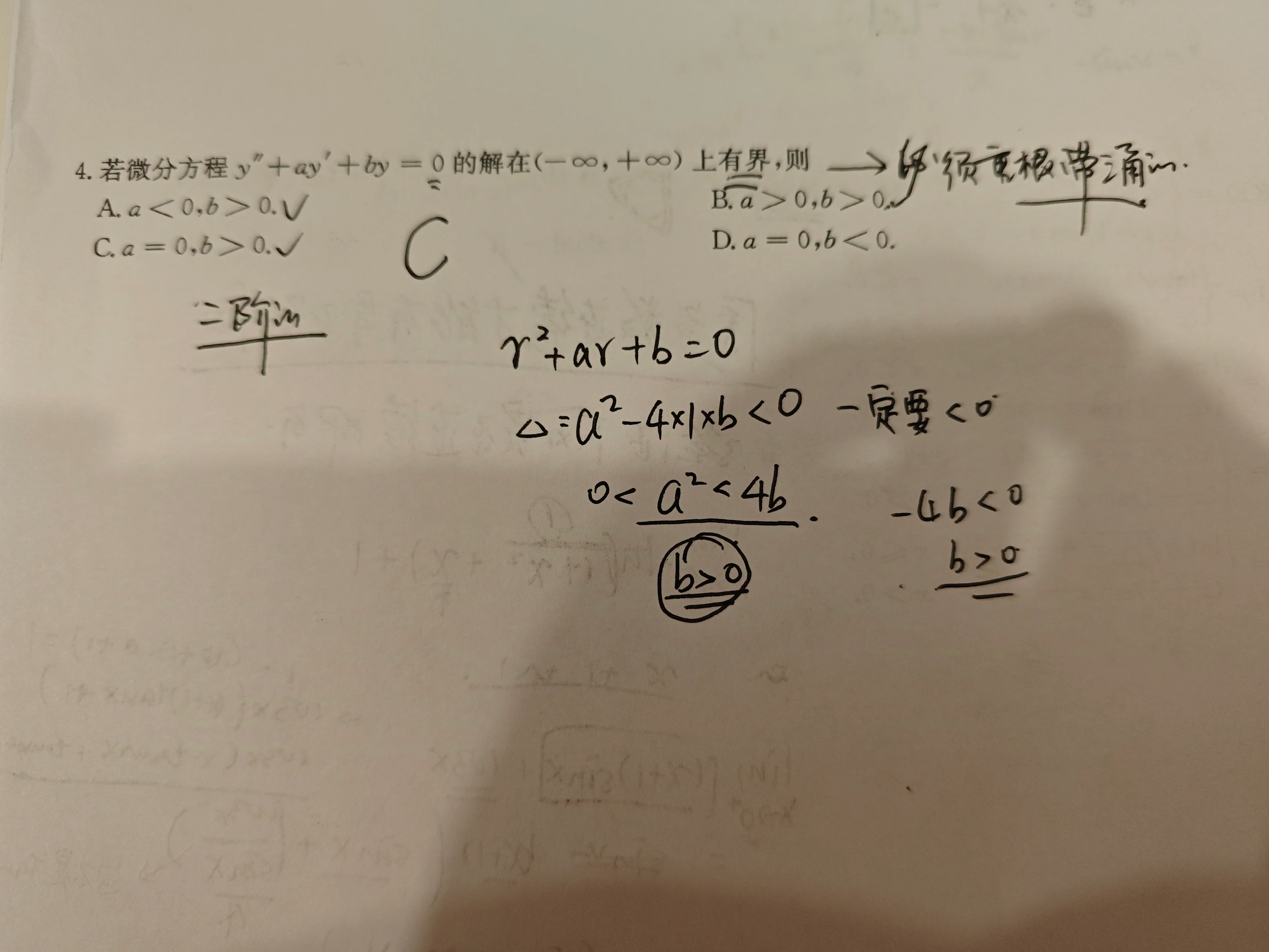 (解) 由于二阶常系数齐次线性微分方程必有零解,而零解为有界解,故微分方程