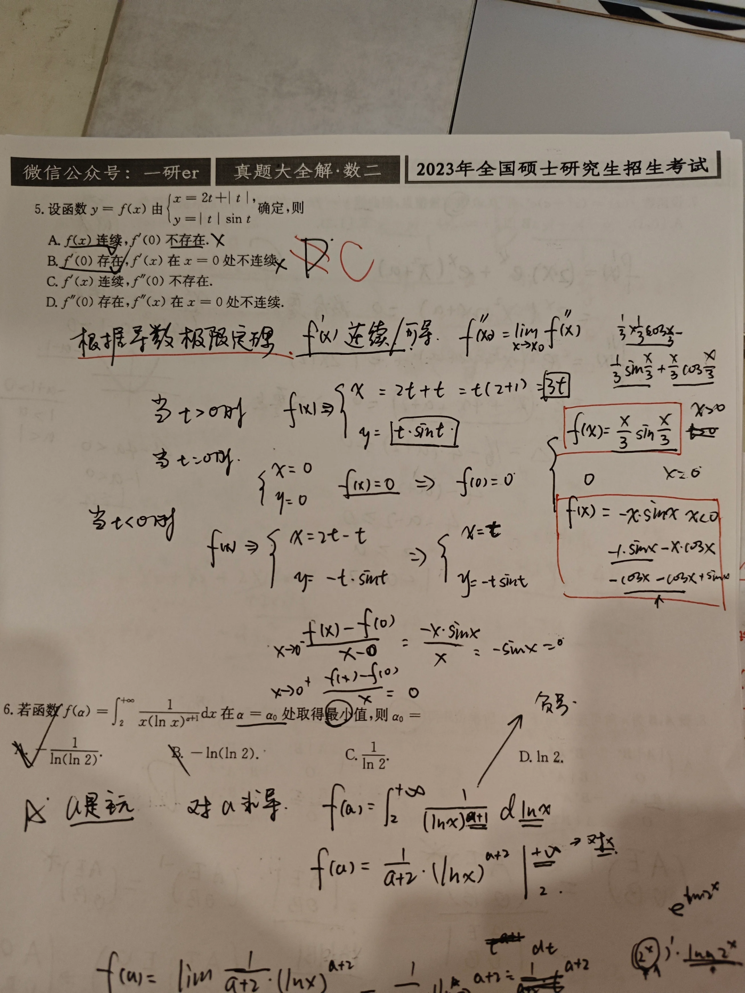 现在第二次做又错了,我这里都已经把这个东西算出来了就不应该有问题了啊:例4.9,还是这个问题,分段函数我们判断它的导数再某点处是否存在,应该去使用定义,如果直接对着分段的表达式导,风险很大。注意了,根据可微、连续,可导之间的关系,我们知道,连续推不出来可导,我一直在错误使用导数极限定理,我们使用的导函数的极限和导数之间相等的关系得是,f本身可导,而f是否可导,这个只能通过定义来看,而不是是否连续