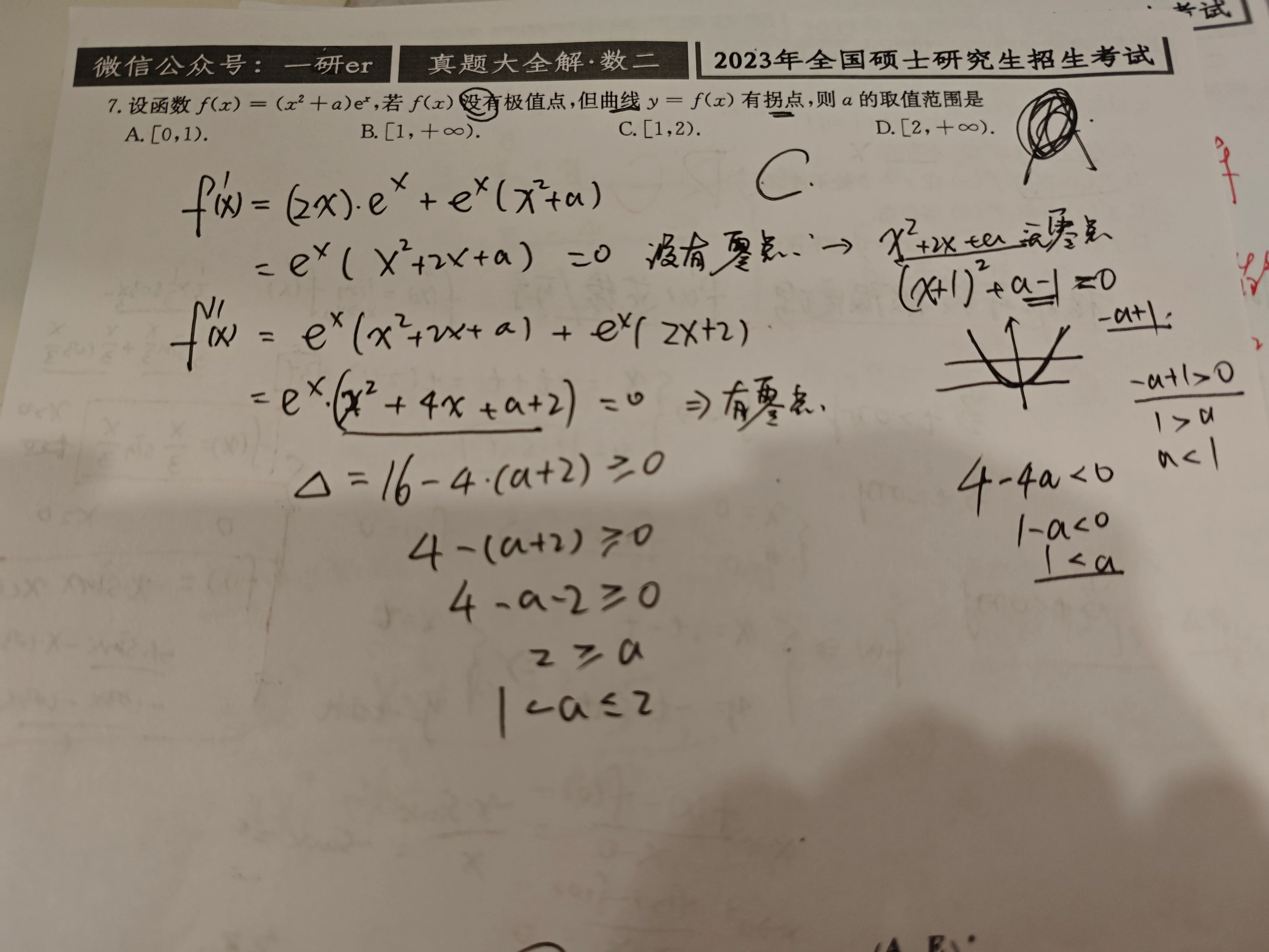 由于 二阶可导,故由极值的第一充分条件可知, 没有极值点说明 不变号. 这意味着 的判别式 ,解得 .