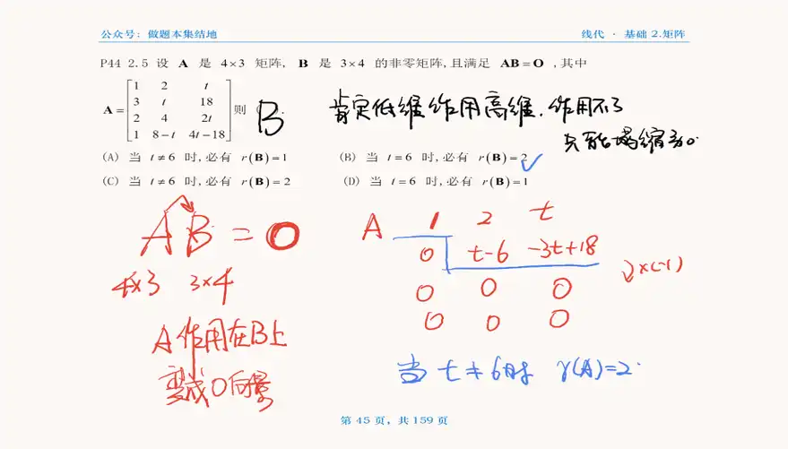 A:A矩阵作用在B矩阵上,得到零向量,因为低维度的向量无法“作用”上高维度的向量上,所以才会导致,高维度的B矩阵坍缩成0矩阵,也就是说,A矩阵的秩是2或者1,同时B的秩是大于等于A的秩的