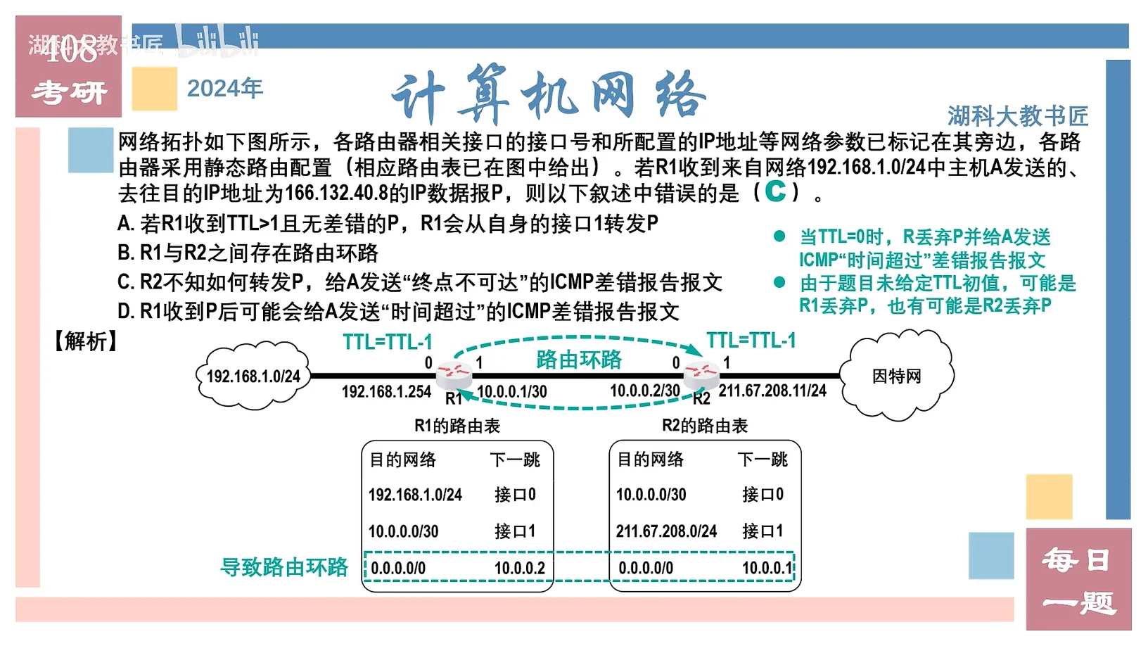 D.R1收到P后可能会给A发送“时间超过”的ICMP差错报告报文
