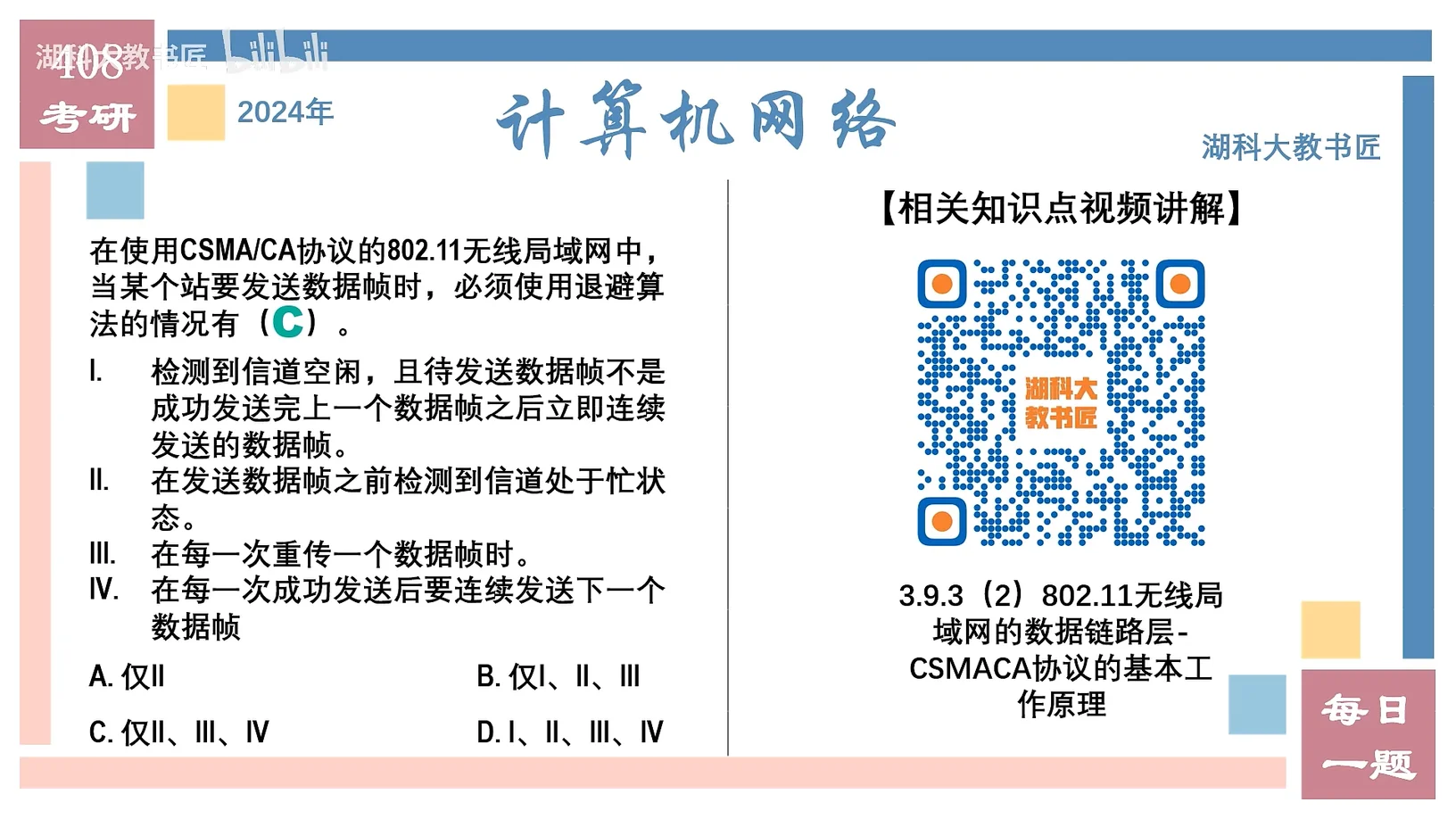 I.检测到信道空闲,且待发送数据帧不是成功发送完上一个数据帧之后立即连续发送的数据帧