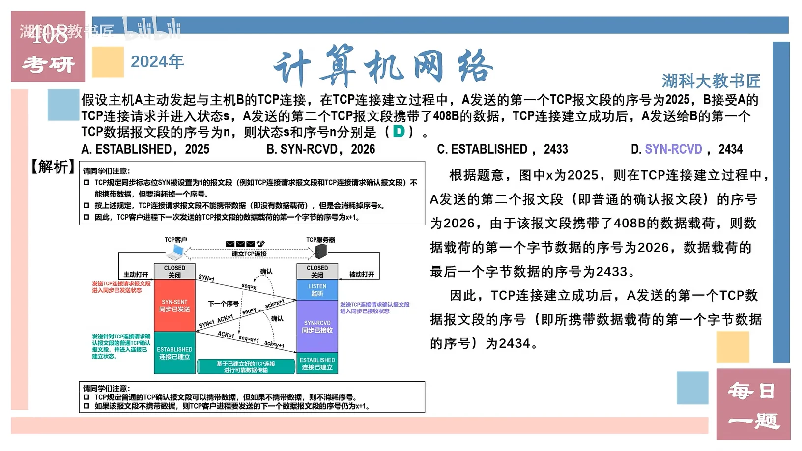 假设主机A主动发起与主机B的TCP连接,在TCP连接建立过程中,A发送的第一个TCP报文段的序号为2025,B接受A的TCP连接请求并进入状态S,A发送的第二个TCP报文段携带了408B的数据,TCP连接建立成功后,A 发送给B的第一个 TCP数据报文段的序号为n,则状态s和序号 n分别是()