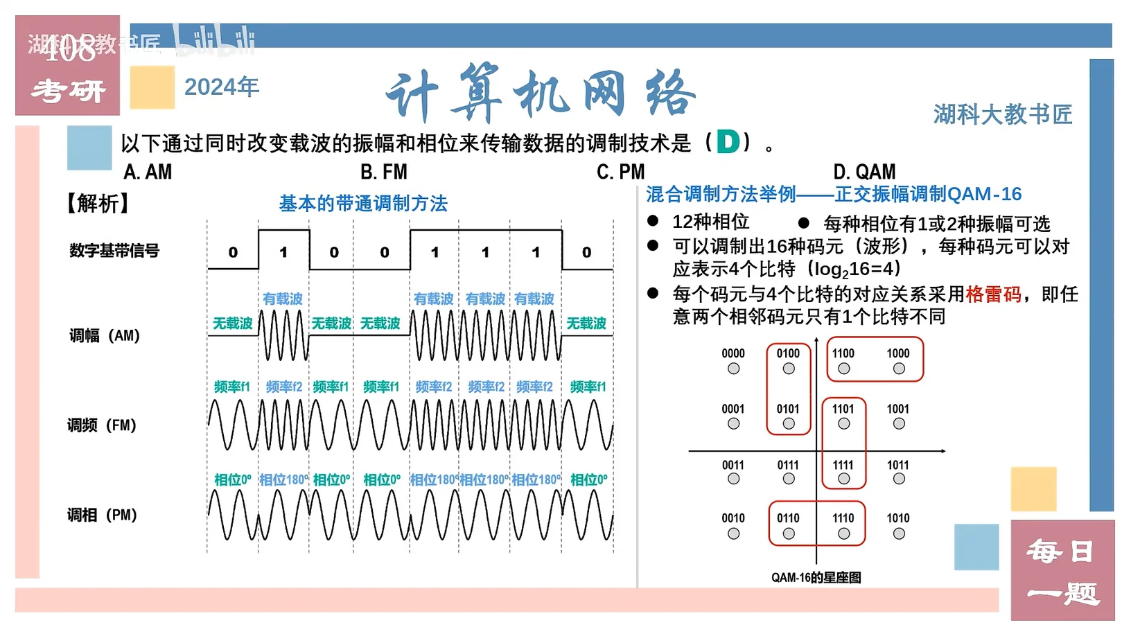 - QAM: QAM 代表 Quadrature Amplitude Modulation,中文是正交幅度调制。它是一种结合了幅度调制和相位调制的技术。它把信息编码成振幅和相位的组合,这样可以在相同的带宽内传输更多的数据。可以想象成,我们不仅改变海浪的高度,还改变它的起始位置,从而表达更多的信息。