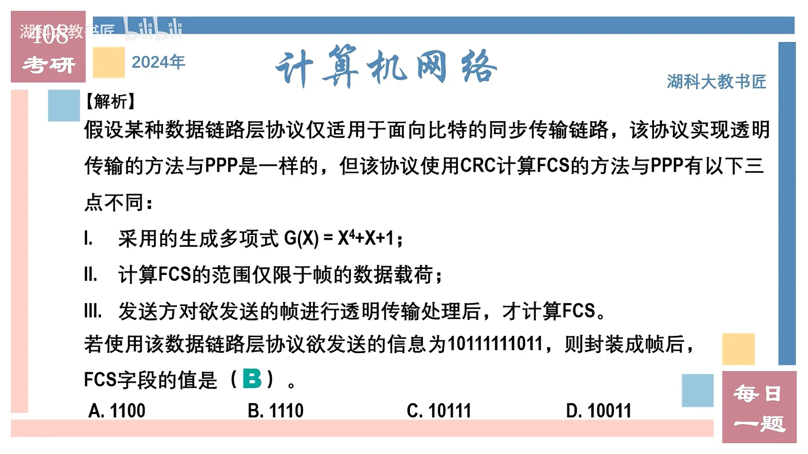 若使用该数据链路层协议欲发送的信息为10111111011,则封装成帧后,FCS字段的值是()
