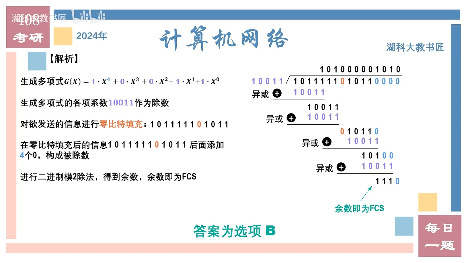 A:先进行比特填充,再进行透明传输,然后按照他说的,计算循环冗余校验就可以了