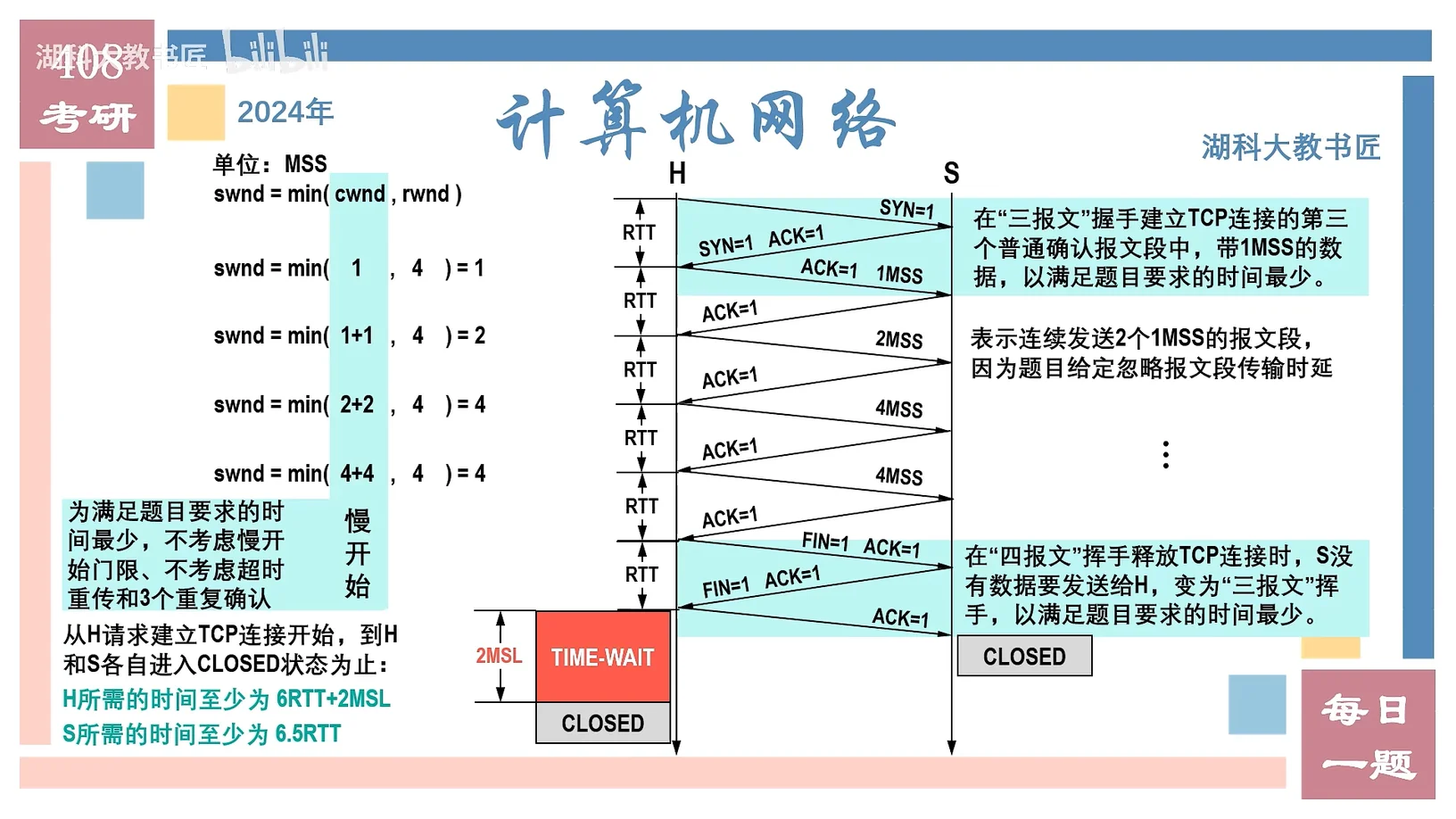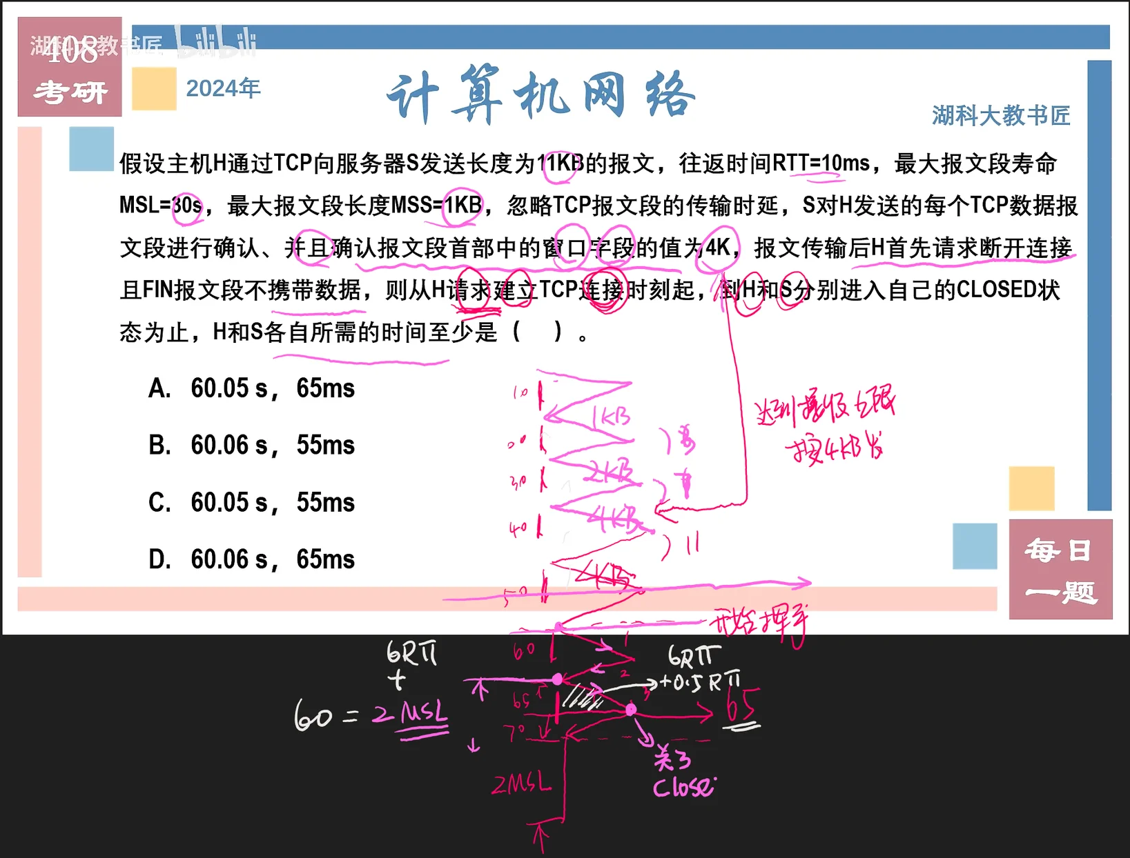和真题:题38放在一起对比着看,还有一年的真题:题57。关闭问题的最短时间,核心在于,接收方,在TCP连接释放的时候可以只三次挥手,其中的第三次挥手是用来确保数据完整性的,如果不传数据那么只需要三次就可以了