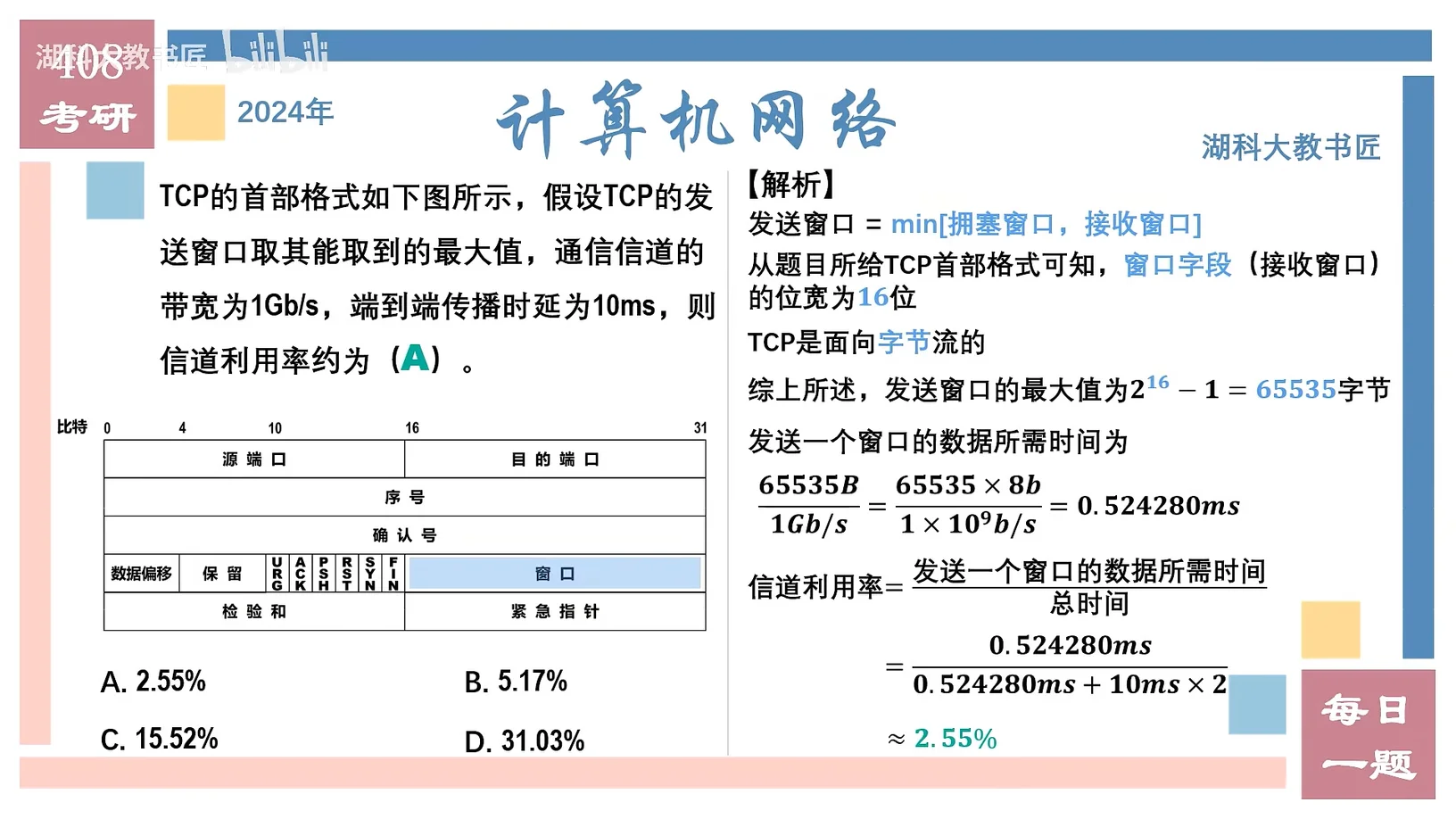 A:和共享式以太网的信道利用率放在一起看吧,虽然这个TCP不是共享以太网,但是学一下信道利用率应该怎么算,一个窗口的时间=数据总量/速度,利用率是这个窗口所需的时间/总时间