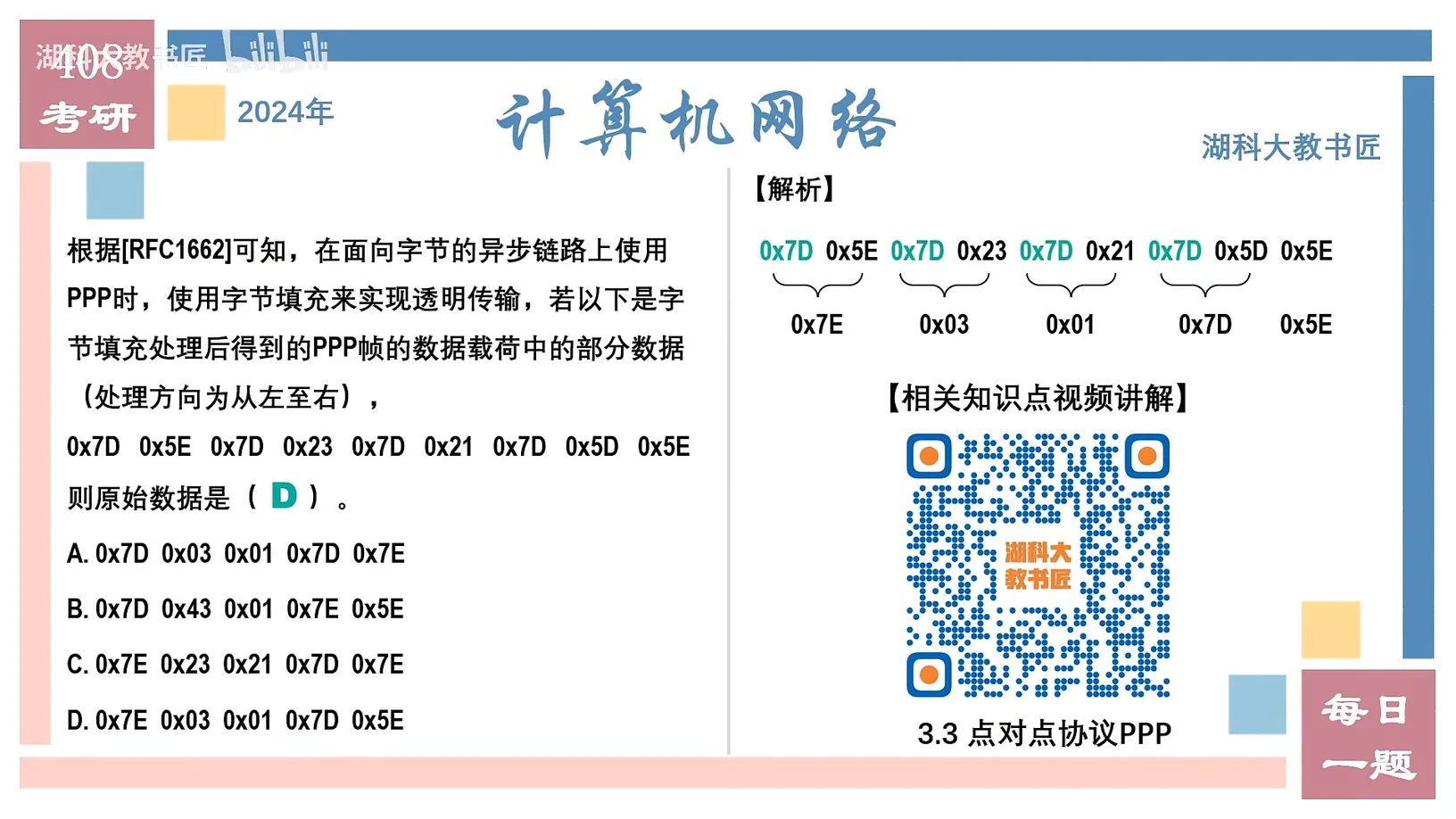 A:这个题目属于是:面向字节的异步链路透明传输,把握一个重点就是,发送串里面不要带0x7d,不要带0x7e,0x7d一般是后来加的
