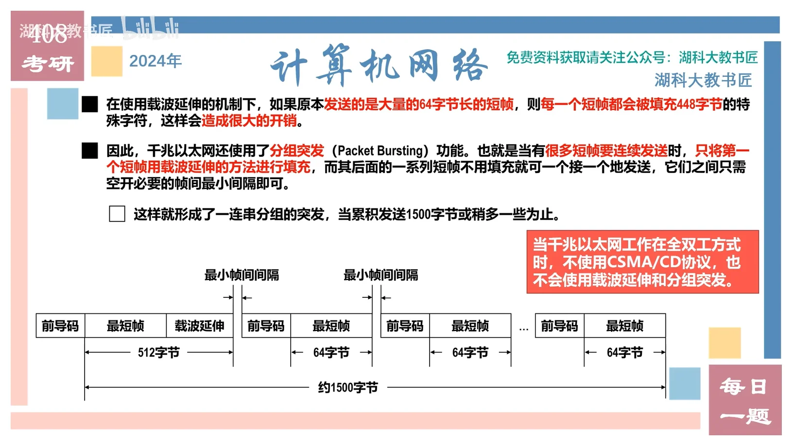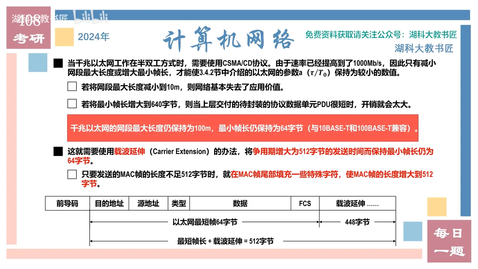 关于CD载波延伸,扩充到512字节这个考点,我们之前还做到过:题1,吉比特以太网又叫做千兆网,上面这个题目里面也是千兆网