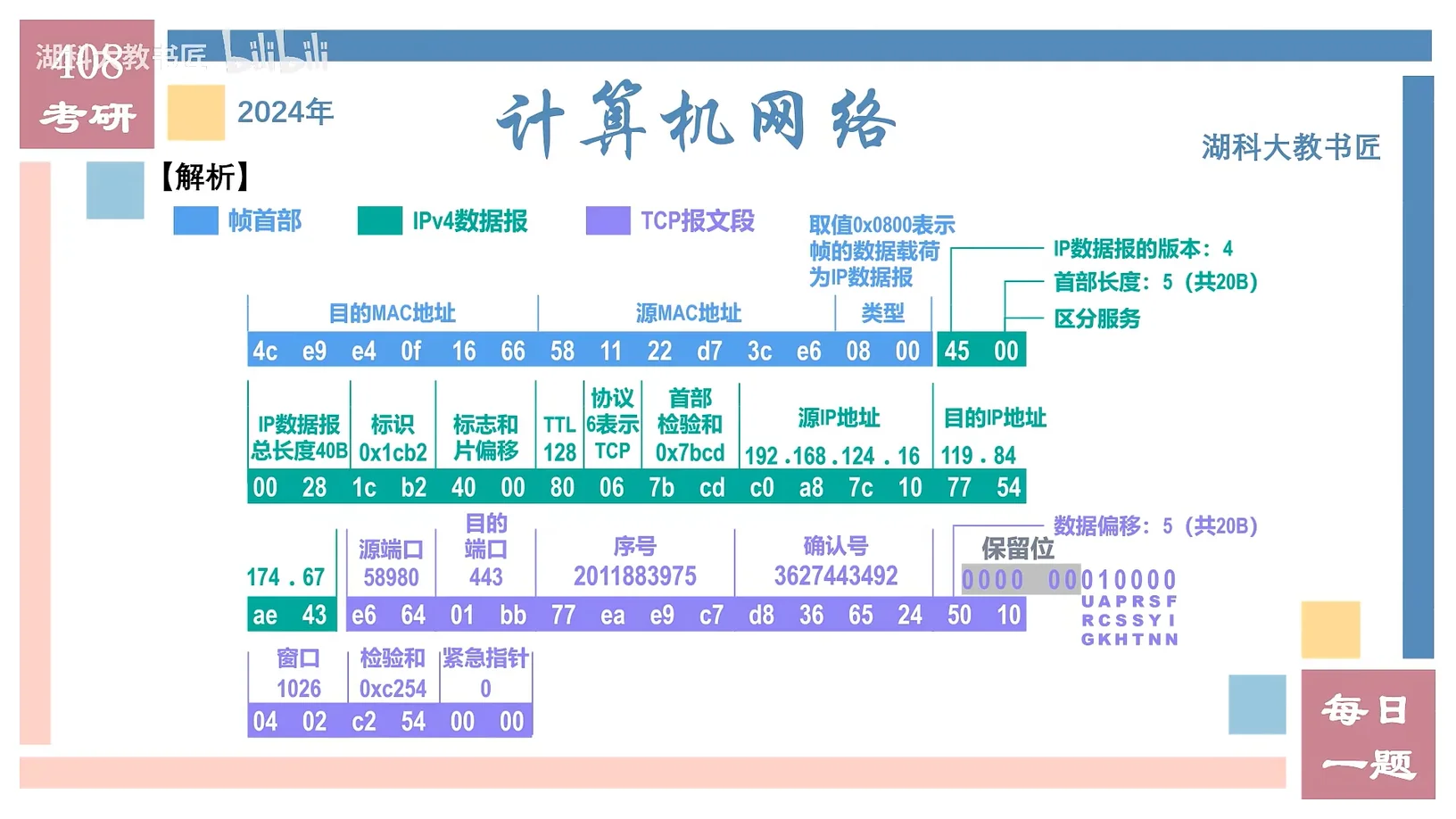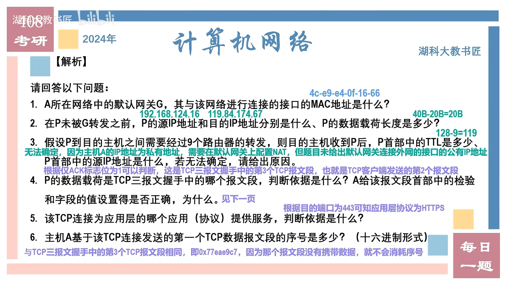 到目的主机之间需要经过9个路由器的转发,则目的主机收到 后, 首部中的TTL是多少、 首部中的源IP地址是什么,若无法确定,请给出原因。 的数据载荷是TCP三报文握手中的哪个报文段,判断依据是什么? A给该报文段首部中的检验和字段的值设置得是否正确,为什么? - 该TCP连接为应用层的哪个应用(协议)提供服务,判断依据是什么?
