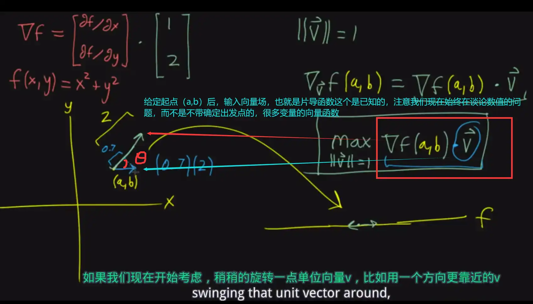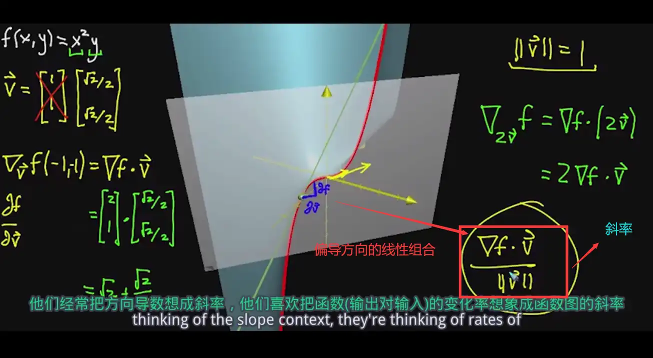 而这个点积,就是给定方向上,偏导函数的线性组合,xy方向上的偏导各自要出多大的力,在给定的方向上,他们的线性组合决定了这个方向上的变化快慢